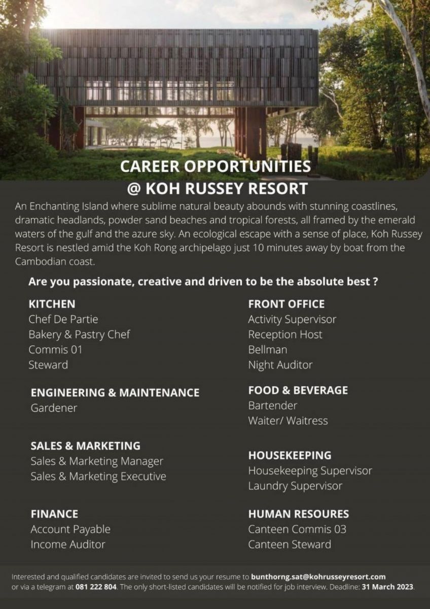 កោះ ឫស្សី រីសត យើងខ្ញុំ កំពុងជ្រើសរើសបុគ្គលិកជាច្រើនផ្នែកដូចខាងក្រោម៖