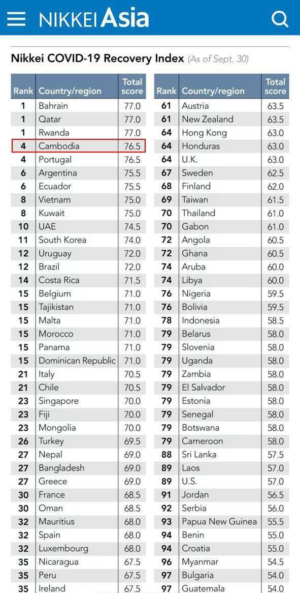 សារព័ត៌មានល្បាញល្បីរបស់ជប៉ុន គឺ Nikkei Asia បានធ្វើចំណាត់ថ្នាក់ដោយរកឃើញថា កម្ពុជាបានឈរនៅលំដាប់លេខ ៤ លើ ១២១ ប្រទេស ថាជាប្រទេសដែលបានស្ដារសេដ្ឋកិច្ចបានលឿន នៅក្រោយវិបត្តិកូវីដ-១៩។