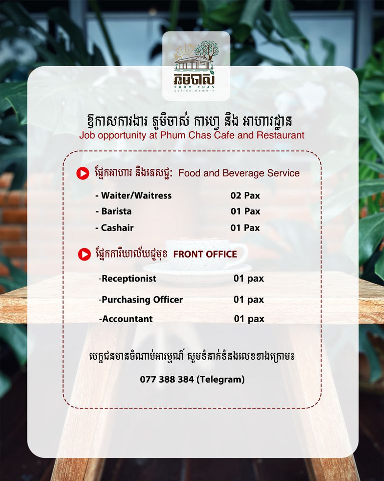 ភូមិចាស់ កាហ្វេ និងភោជនីយដ្ឋាន Phumchas Cafe and Restaurant យើងខ្ញុំត្រូវការជ្រើសរើសបុគ្គលិកជាច្រើនផ្នែក :