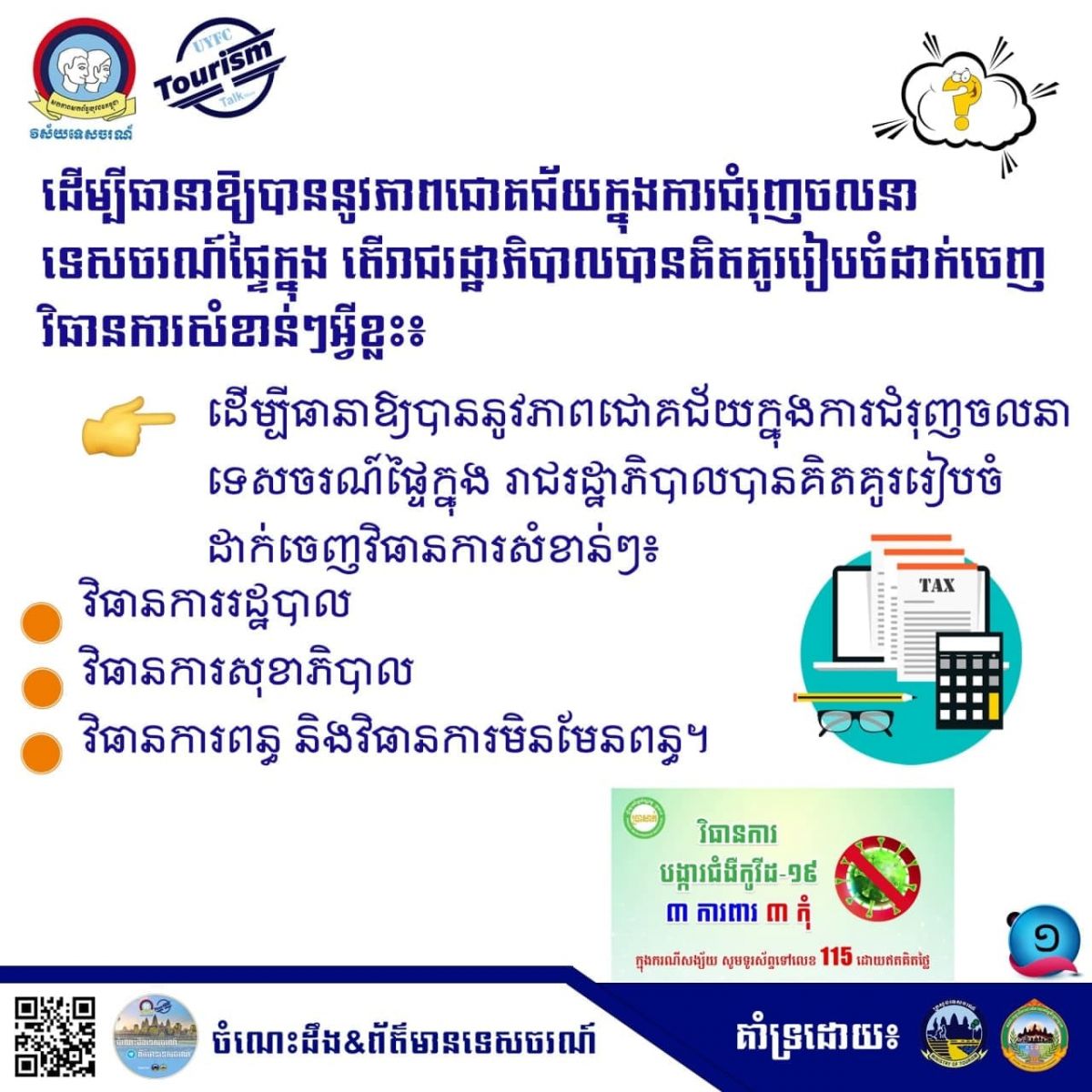 តើដើម្បីធានាឱ្យបាននូវភាពជោគជ័យក្នុងការជំរុញចលនាទេសចរណ៍ផ្ទៃក្នុង រាជរដ្ឋាភិបាលបានគិតគូររៀបចំដាក់នូវវិធានការសំខាន់ចំនួនប៉ុន្មាន?អ្វីខ្លះ? ហើយវិធានការទាំងនោះមានគោលដៅអ្វីខ្លះ? - វេបសាយ ស.ស.យ.ក. វិស័យទេសចរណ៍