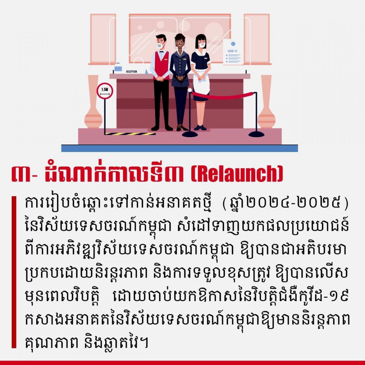 តើផែនទីចង្អុលផ្លូវស្ដីពី ផែនការស្ដារ និង លើកស្ទួយវិស័យទេសចរណ៍ក្នុង និងក្រោយវិបត្តិជំងឺកូវីដ-១៩ បែងចែងជាប៉ុន្មានដំណាក់កាល? - វេបសាយ ស.ស.យ.ក. វិស័យទេសចរណ៍