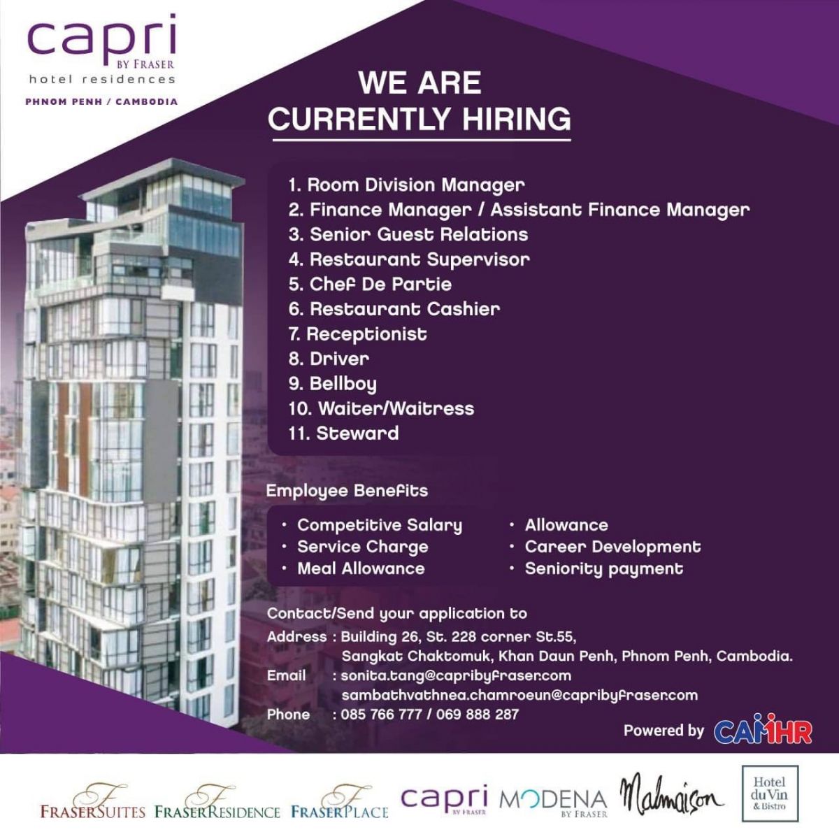- Email : sonita.tang@capribyfraser.com or sambathvathnea.chamroeun@capribyfraser.com