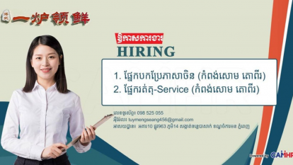 1.ផ្នែកបកប្រែភាសាចិន (កំពង់សោម តោពីរ) 2. ផ្នែករត់តុ-Service (កំពង់សោ ម តោពីរ)