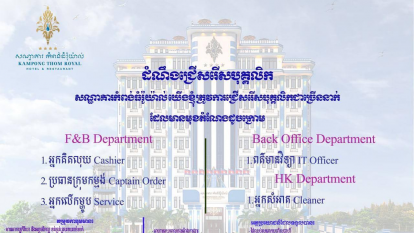 ឱកាសការងារក្នុងវិស័យទេសចរណ៍ សណ្ឋាគារកំពង់ធំរ៉ូយ៉ាល់ Kampongthom Royal Hotel