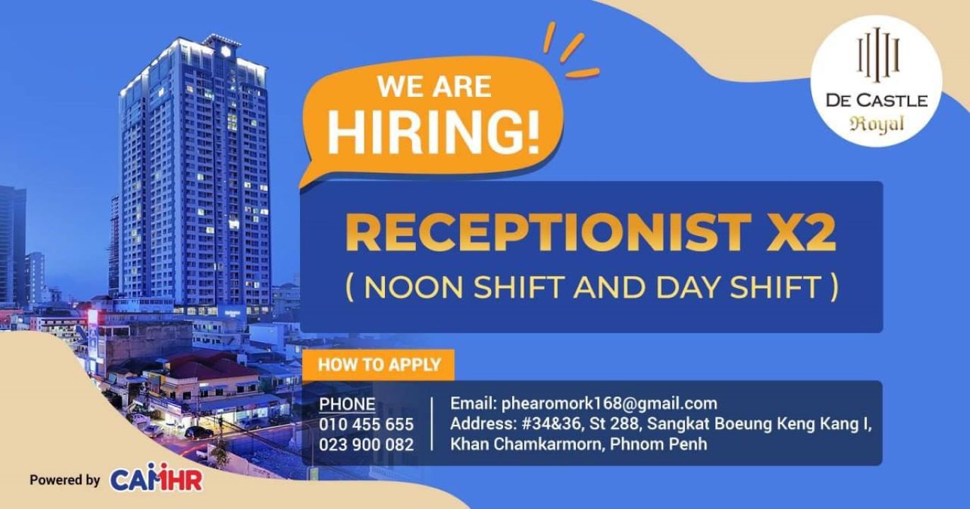 G Proav Co.,ltd ( De Castle Royal) ត្រូវការជ្រើសរើសបុគ្គលិកផ្នែក Receptionist ចំនួន 2នាក់ ( Noon Shift and Day Shift )!!