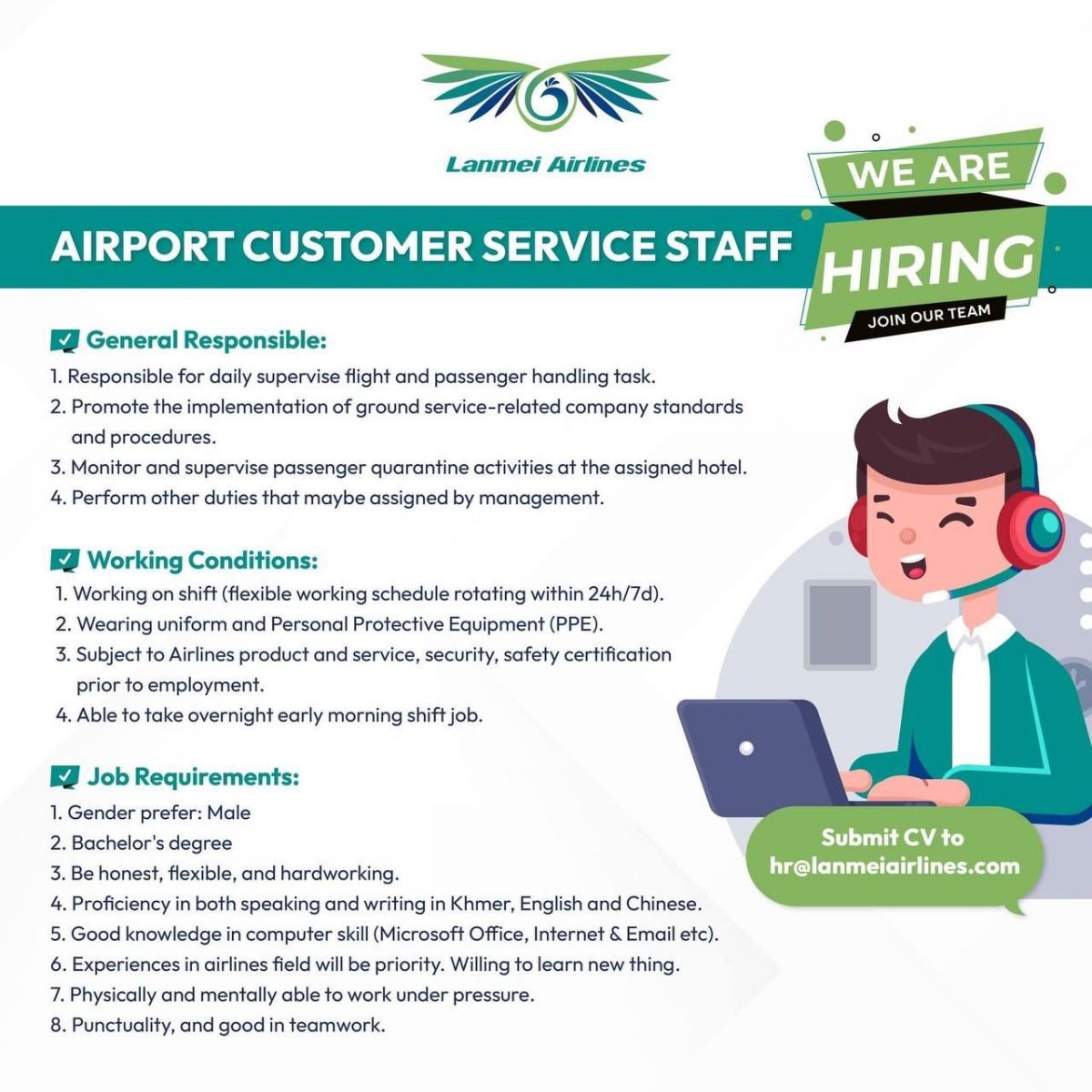ក្រុមហ៊ុន Lanmei Airlines កំពុងត្រូវការជ្រើសរើសបុគ្គលិកផ្នែក: AIRPORT CUSTOMER SERVICE STAFF