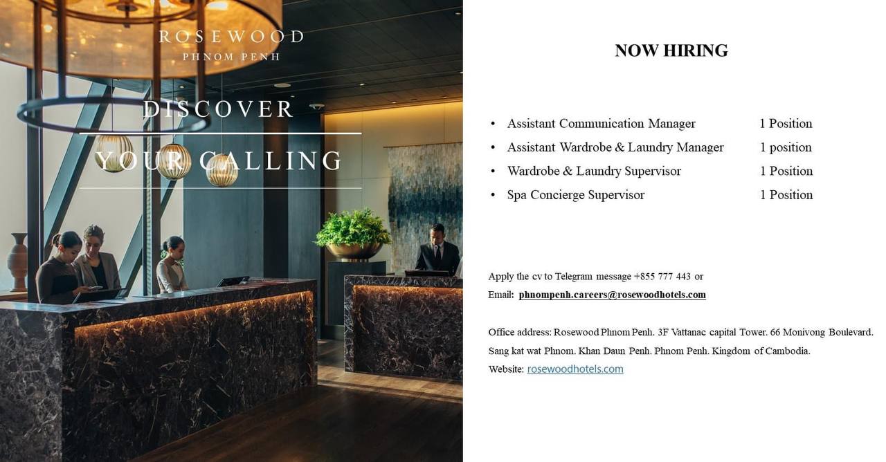 Rosewood Phnom Penh កំពុងត្រូវការជ្រើសរើសបុគ្គលិកច្រើនផ្នែក៖