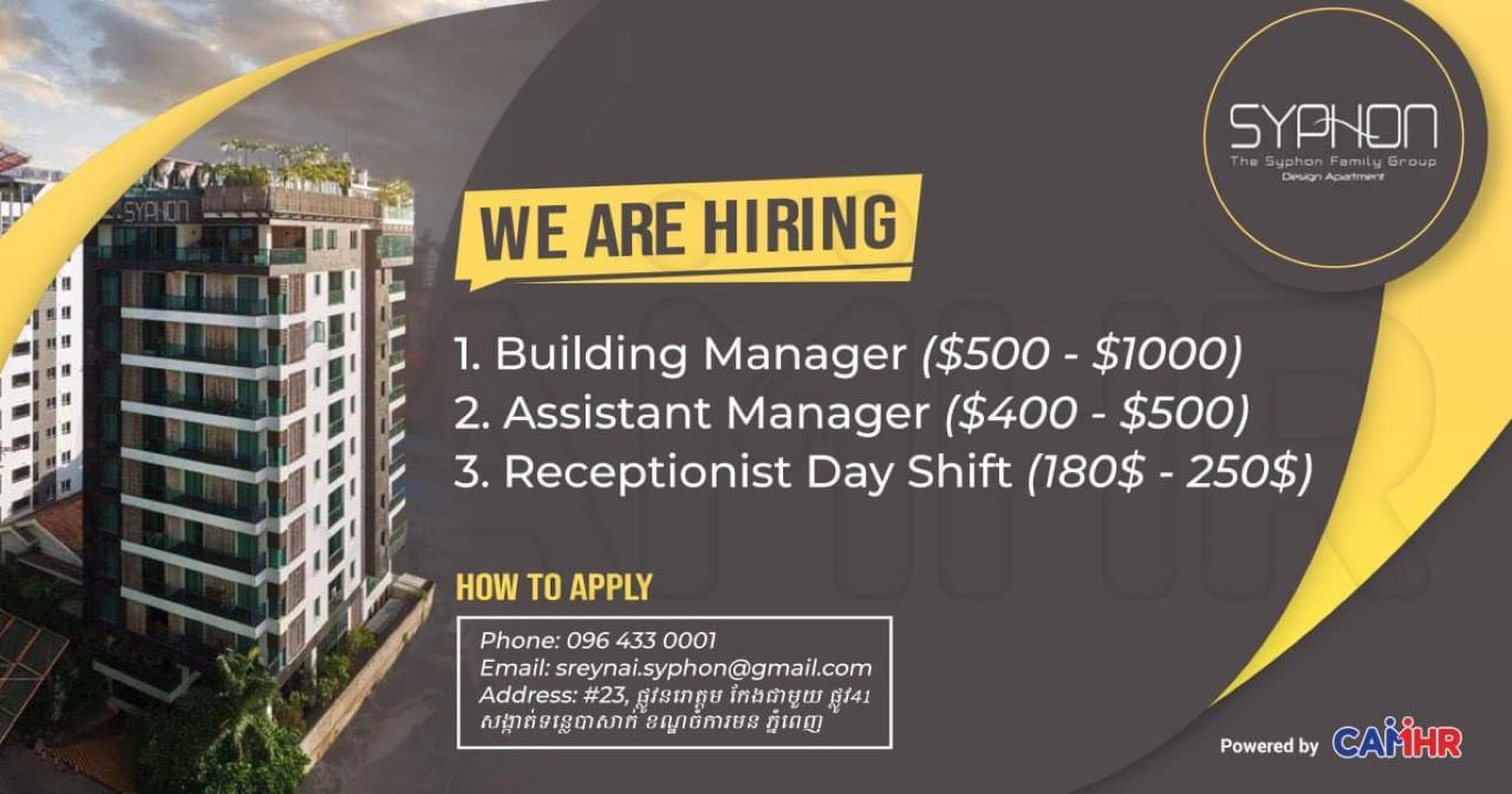 SYPHON APARTMENT & HOTEL យើងខ្ញុំត្រូវការជ្រើសរើសបុគ្គលិកជាច្រើនផ្នែកដូចជា៖