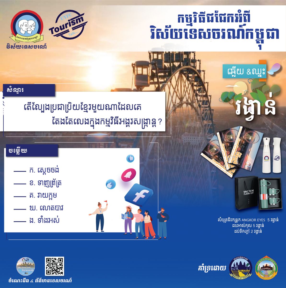 អបអរសាទរចំពោះអ្នកឈ្នះរង្វាន់សំបុត្រជិះកន្រ្តក ដបទឹក និងដបអាល់កុល របស់កម្មវិធីជជែកអំពីវិស័យទេសចរណ៍ (UYFC Tourism Talk Show) ចំនួន ១២រូប ដែលឆ្លើយសំណួរបានត្រឹមត្រូវ និងគោរពតាមលក្ខខណ្ឌ - វេបសាយ ស.ស.យ.ក. វិស័យទេសចរណ៍