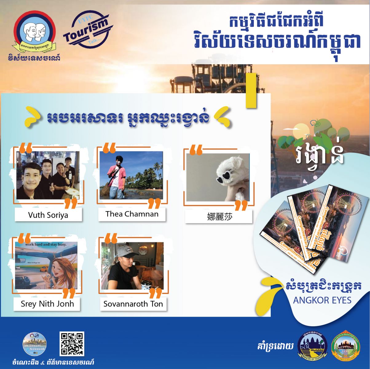 អបអរសាទរចំពោះអ្នកឈ្នះរង្វាន់សំបុត្រជិះកន្រ្តក(Angkor Eye)  ដបទឹក និងដបអាល់កុល របស់កម្មវិធីជជែកអំពីវិស័យទេសចរណ៍ (UYFC Tourism Talk Show) ចំនួន ១២រូប ដែលឆ្លើយសំណួរបានត្រឹមត្រូវ និងគោរពតាមលក្ខខណ្ឌ។
