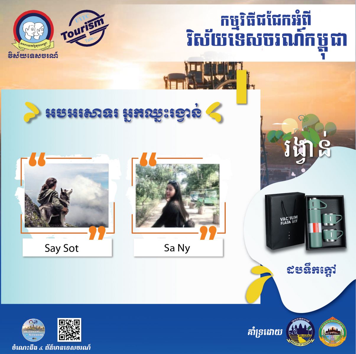 បញ្ជាក់៖ សម្រាប់អ្នកឈ្នះរង្វាន់ សូមផ្ញើសារ (Inbox) មកកាន់ផេករបស់សហភាពសហព័ន្ធយុវជនកម្ពុជា វិស័យទេសចរណ៍ ដើម្បីទទួលបានព័ត៌មានបន្ថែម។