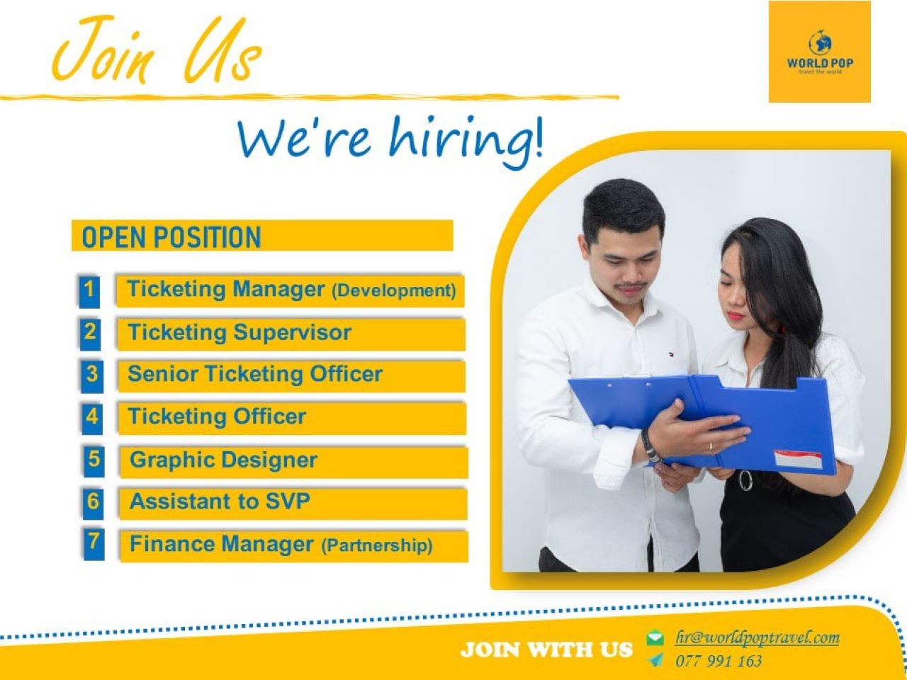 World Pop Travel and Tour យើងខ្ញុំត្រូវការជ្រើសរើសបុគ្គលិកជាច្រើនមុខដំណែងដូចខាងក្រោម ៖