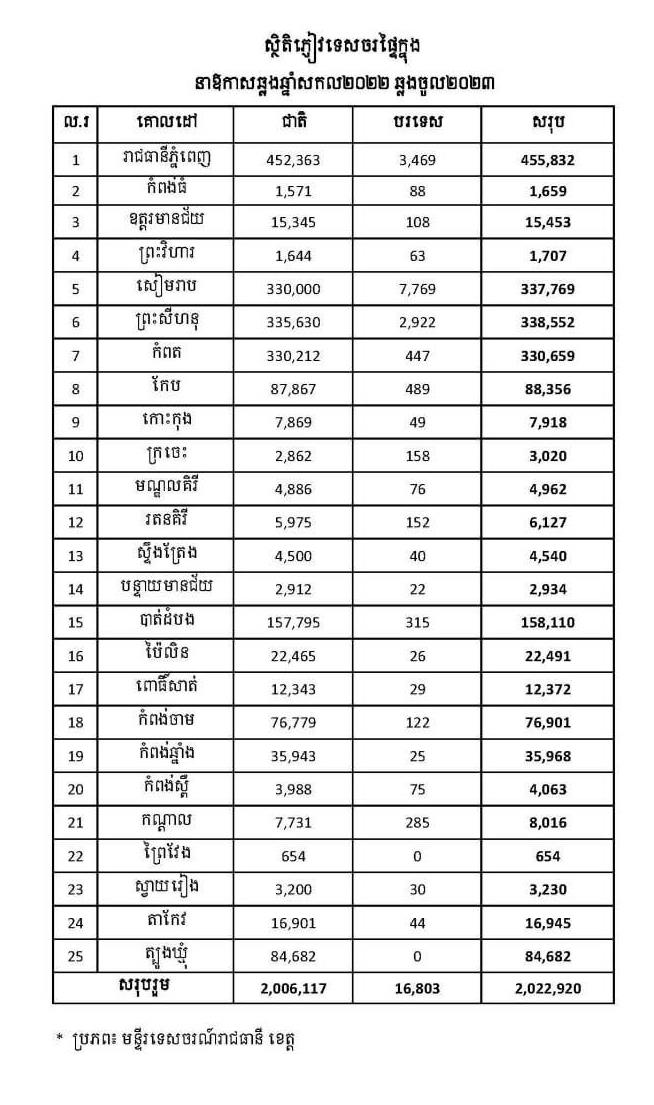 (ភ្នំពេញ)៖ លោក ថោង ខុន រដ្ឋមន្ត្រីក្រសួងទេសចរណ៍ នាយប់ថ្ងៃទី១ ខែមករា ឆ្នាំ២០២៣នេះ បានឱ្យដឹងថា នាឱកាសឆ្លងឆ្នាំសកល ២០២២ ឆ្លងចូល ២០២៣ (៣១ ខែធ្នូ ឆ្នាំ២០២២ ឆ្លងចូលថ្ងៃ១ ខែមករា ឆ្នាំ២០២៣) នៅទូទាំងប្រទេសទទួលបានភ្ញៀវសរុបប្រមាណ២,០២២,៩២០នាក់ ក្នុងនោះភ្ញៀវជាតិ២,០០៦,១១៧នាក់ និងភ្ញៀវបរទេស១៦,៨០៣នាក់។