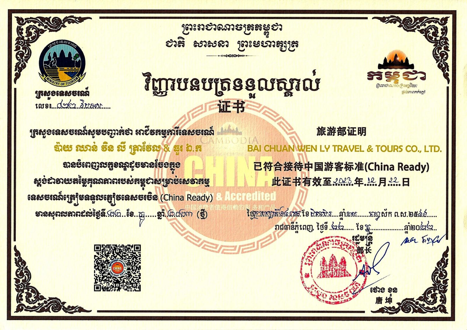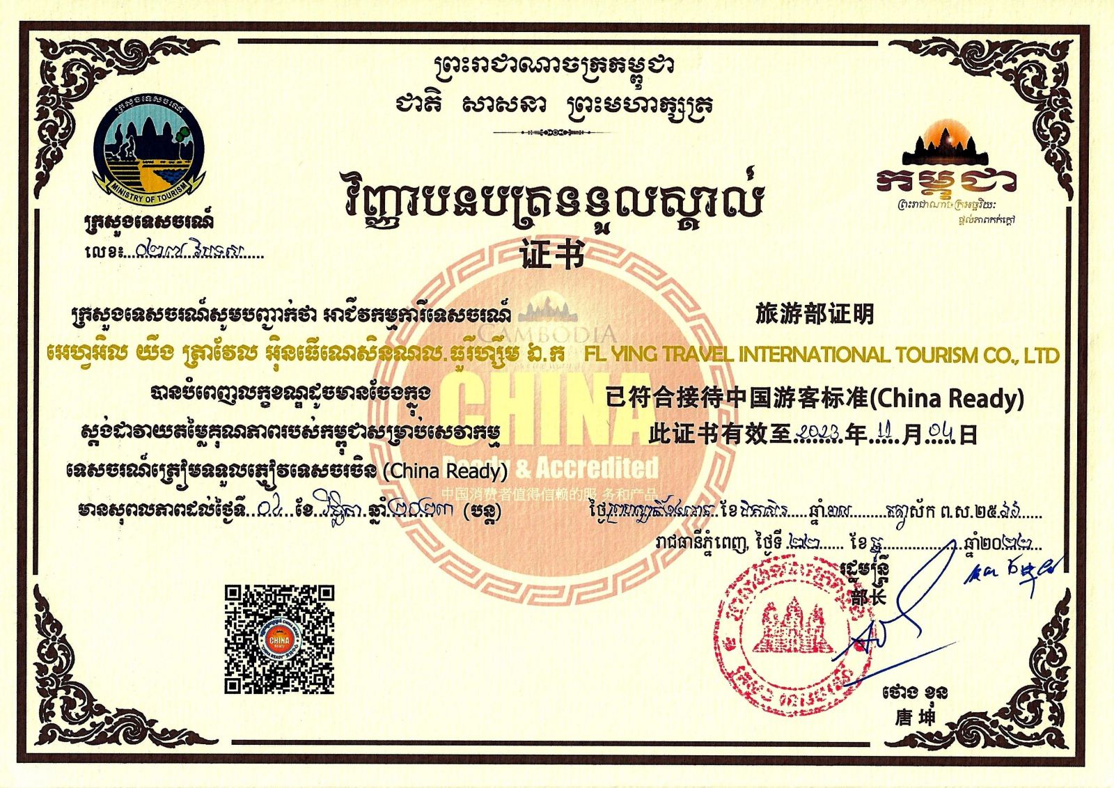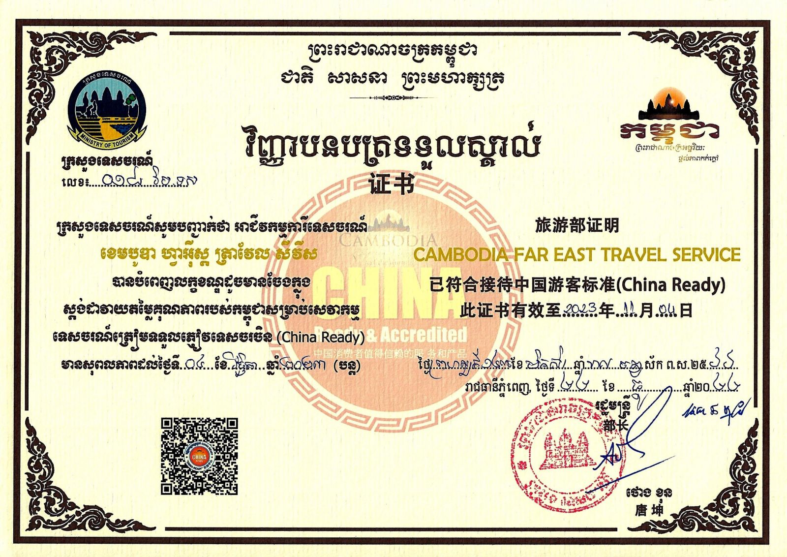ក្រសួងទេសចរណ៍ ក៏បានបន្តលើកទឹកចិត្តឱ្យអាជីវកម្មទេសចរណ៍ដែលទទួលទេសចរចិន មកដាក់ពាក្យស្នើសុំការទទួលស្គាល់គុណភាពសេវាកម្មទទទួលទេសចរចិន (China Ready Accreditation) ដោយឥតគិតថ្លៃ នៅទីស្តីការក្រសួងទេសចរណ៍ ដែលមានអស័យដ្ឋានដីទ្បូតិ៍លេខ 3A ផ្លូវលេខ១៦៩ សង្កាត់វាលវង់ ខណ្ឌ៧មករា រាជធានីភ្នំពេញ។