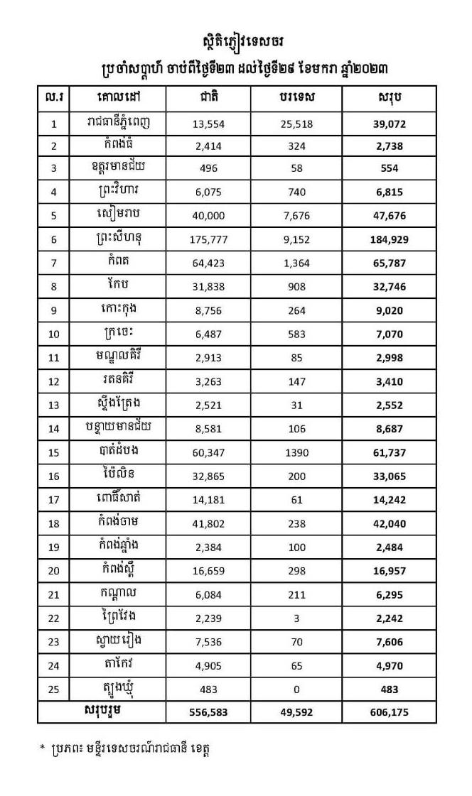 (ភ្នំពេញ)៖ ចាប់ពីថ្ងៃទី២៣-២៩ ខែមករា ឆ្នាំ២០២៣ កម្ពុជាទទួលបានភ្ញៀវទេសចរសរុប៦០៦,១៧៥នាក់ និងភ្ញៀវបរទេស៤៩,៥៩២នាក់។ នេះបើតាមលោក ថោង ខុន រដ្ឋមន្ត្រីក្រសួងទេសចរណ៍។