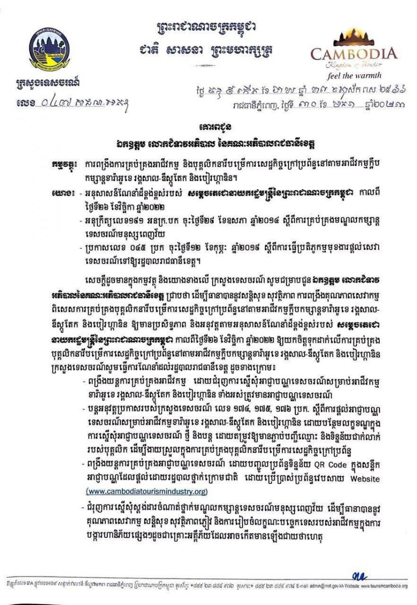៥ ចំណុចរបស់ក្រសួងទេសចរណ៍ណែនាំដល់រដ្ឋបាលរាជធានី-ខេត្ត ស្តីពី ការពង្រឹង ការគ្រប់គ្រង អាជីវកម្ម និងបុគ្គលិកបម្រើការសេដ្ឋកិច្ចក្រៅប្រព័ន្ធ នៅតាមអាជីវកម្មក្លឹបកម្សាន្ត ខារ៉ាអូខេ រង្គសាល ឌីស្កូតែក បៀរហ្កាឌិន និងម៉ាស្សា ស្ប៉ា
