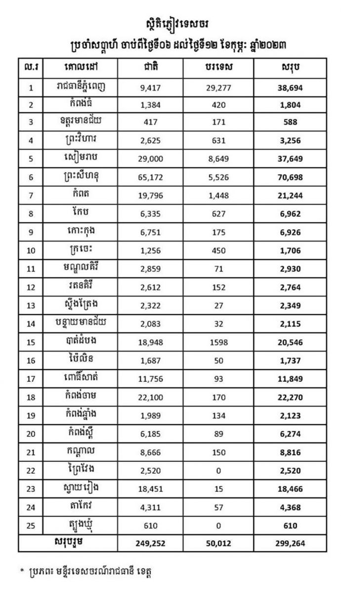 (ភ្នំពេញ)៖ លោក ថោង ខុន រដ្ឋមន្ត្រីក្រសួងទេសចរណ៍ បានបញ្ជាក់ថា គិតចាប់ពីថ្ងៃទី០៦-១២ ខែកុម្ភៈ ឆ្នាំ២០២៣ នៅទូទាំងប្រទេសបានទទួលបានភ្ញៀវទេសចរសរុបចំនួន ២៩៩.២៦៤នាក់ ក្នុងនោះភ្ញៀវជាតិមាន ២៤៩.២៥២នាក់ និងភ្ញៀវបរទេសមាន ៥០.០១២នាក់។