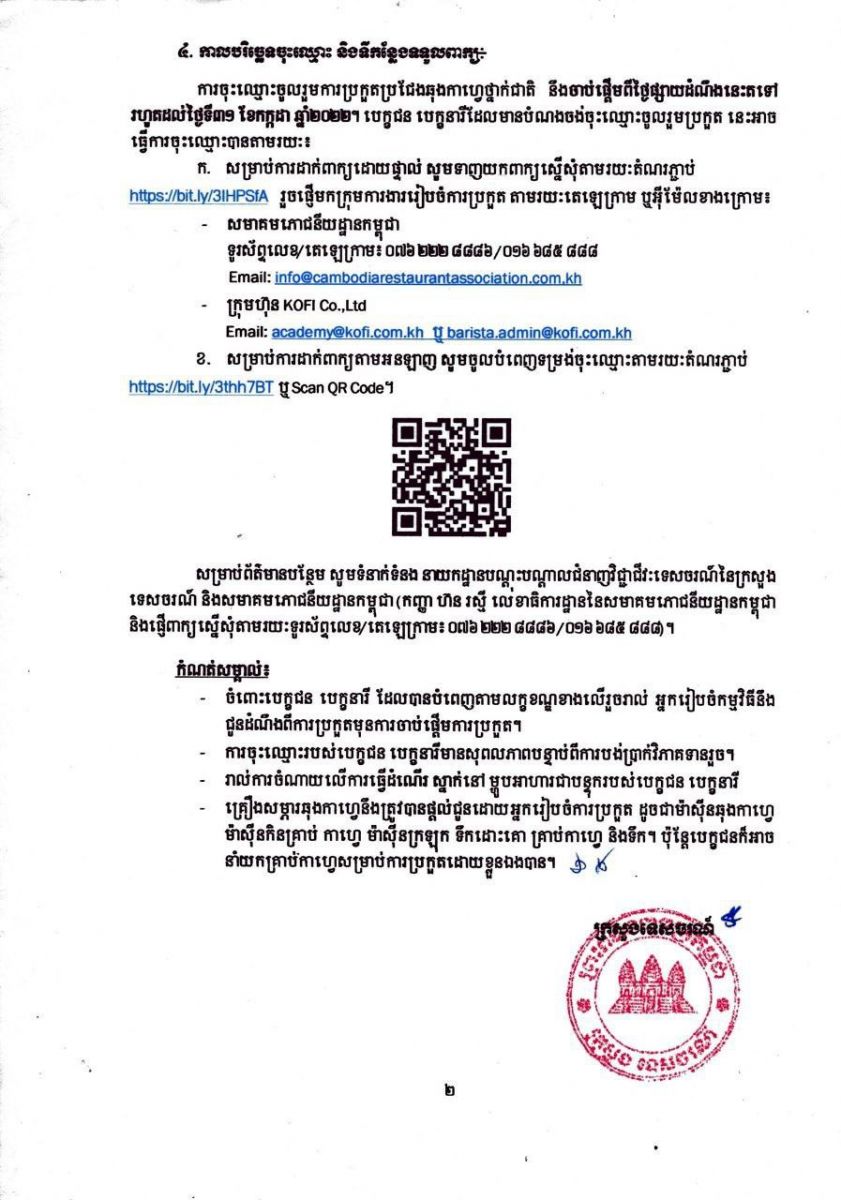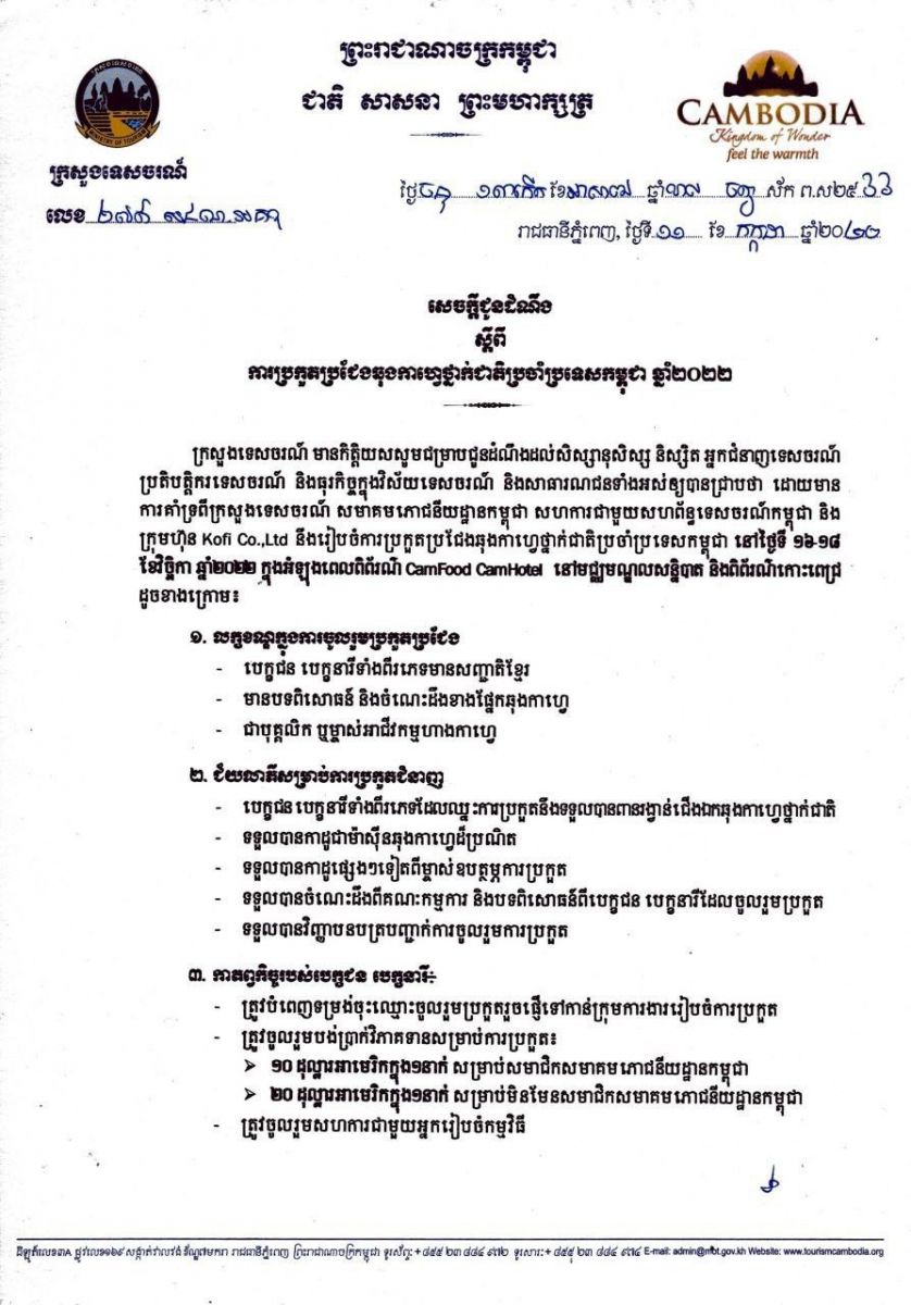 ក្រសួងទេសចរណ៍ចេញសេចក្តីជូនដំណឹង ស្តីពី ការប្រកួតប្រជែងឆុងកាហ្វេថ្នាក់ជាតិប្រចាំប្រទេសកម្ពុជាឆ្នាំ២០២២