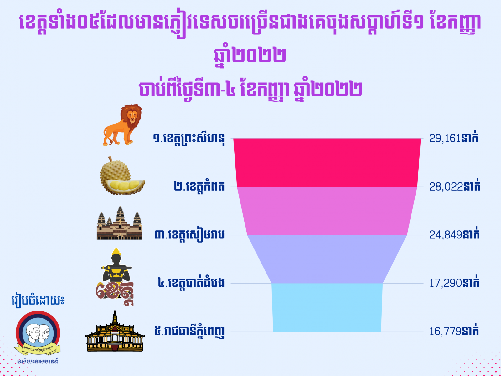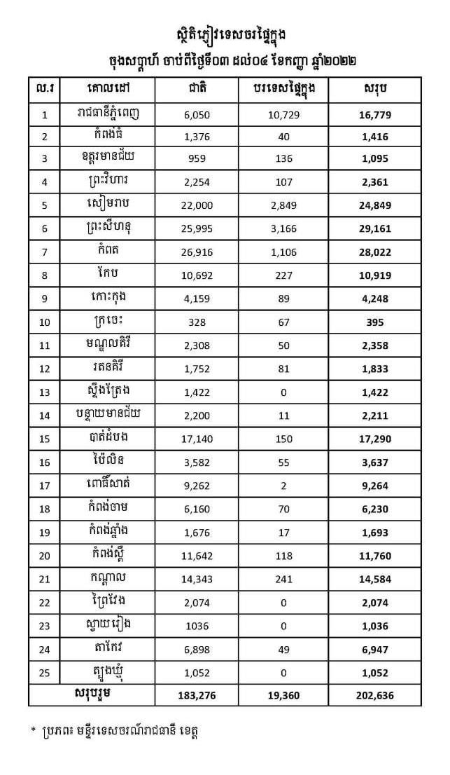 (ភ្នំពេញ)៖ឯកឧត្តម ថោង ខុន រដ្ឋមន្ត្រីក្រសួងទេសចរណ៍ នាថ្ងៃទី៦ ខែកញ្ញា ឆ្នាំ២០២២នេះ បានបង្ហាញពីស្ថានភាពភ្ញៀវទេសចរផ្ទៃក្នុងប្រចាំសប្តាហ៍ថ្ងៃទី៣-៤ ខែកញ្ញា ឆ្នាំ២០២២ ភ្ញៀវសរុបមានចំនួន២០២,៦៣៦នាក់ ក្នុងនោះភ្ញៀវជាតិ១៨៣,២៧៦នាក់ និងភ្ញៀវបរទេសផ្ទៃក្នុង១៩,៣៦០នាក់។