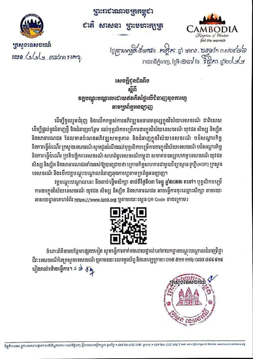 ក្រសួងទេសចរណ៍ចេញសេចក្តីជូនដំណឹងស្តីពីវគ្គបណ្តុះបណ្តាលជំនាញឆុងកាហ្វេដោយឥតគិតថ្លៃ