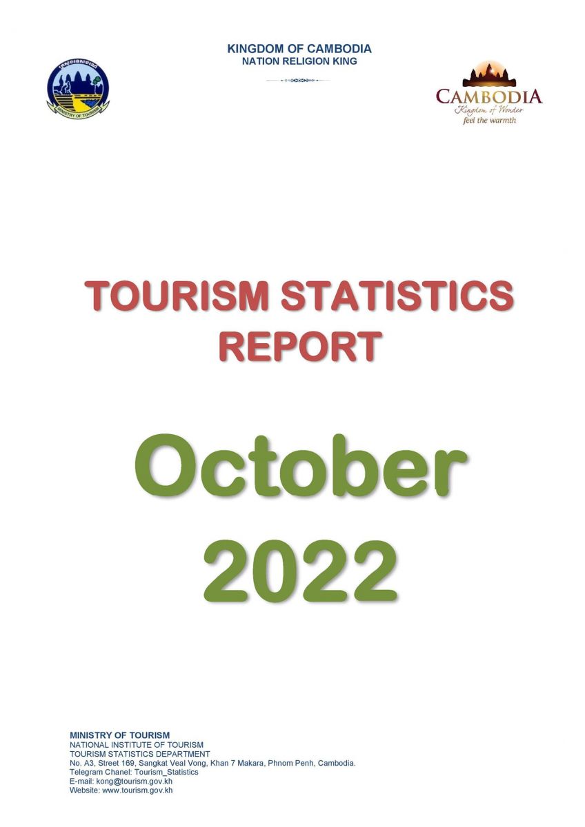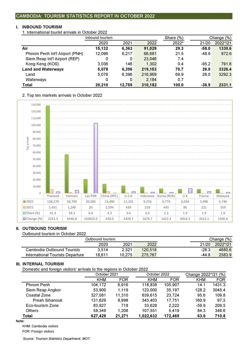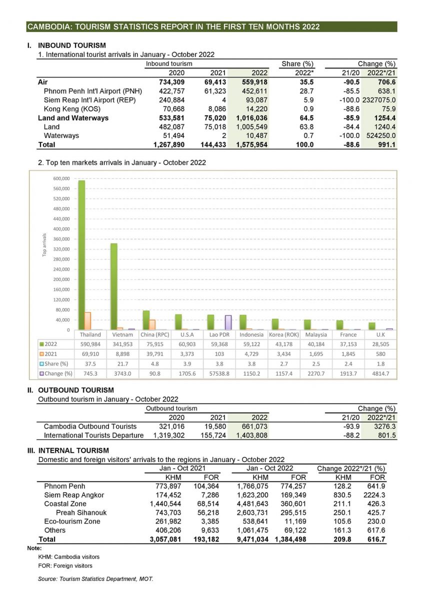 យោងតាមរបាយការណ៍ដដែលនោះ «ភ្ញៀវទេសចរអន្តរជាតិដែលបានមកទស្សនាប្រទេសកម្ពុជា ក្នុងរយៈពេល១០ខែ ចាប់ពីខែមករាដល់ខែតុលា ឆ្នាំ២០២២ គឺមានចំនួនសរុប១,៥៧៥,៩៥៤នាក់ កើនឡើង៩៩១.១ភាគរយ បើធៀបនឹងរយៈពេល១០ខែដូចគ្នានៃឆ្នាំ២០២១»។
