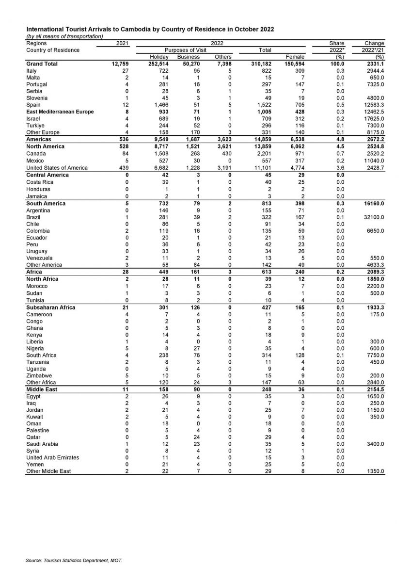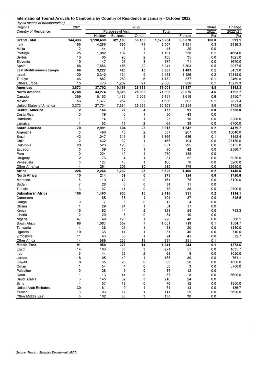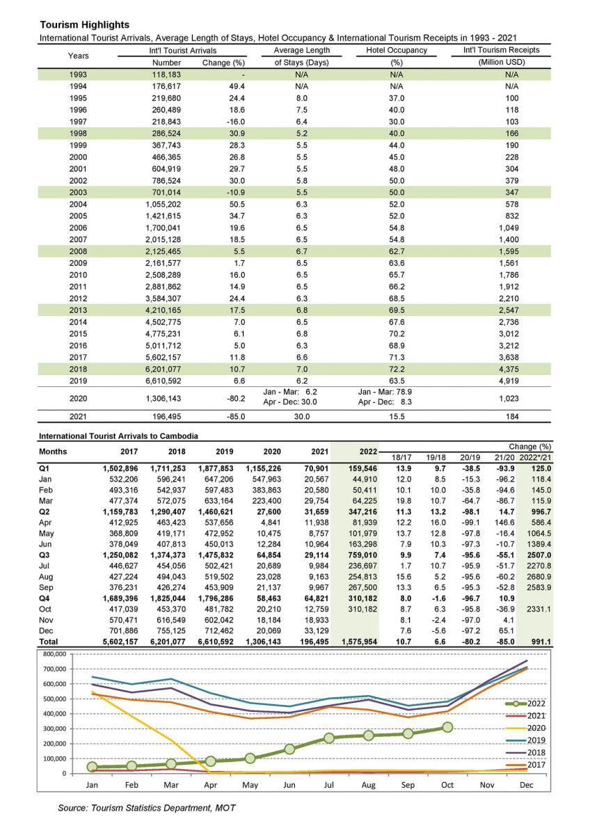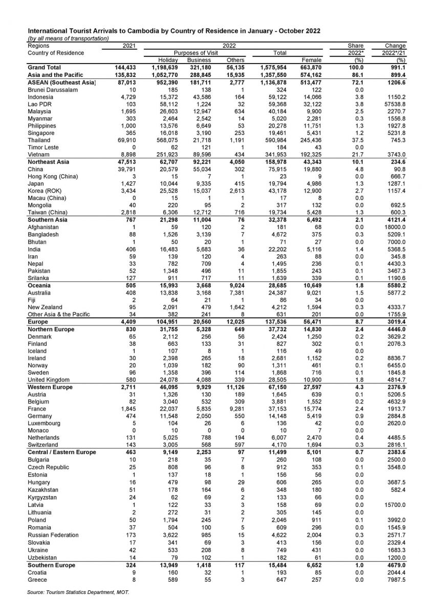យោងតាមរបាយការណ៍ដដែលនោះ «ភ្ញៀវទេសចរអន្តរជាតិដែលបានមកទស្សនាប្រទេសកម្ពុជា ក្នុងរយៈពេល១០ខែ ចាប់ពីខែមករាដល់ខែតុលា ឆ្នាំ២០២២ គឺមានចំនួនសរុប១,៥៧៥,៩៥៤នាក់ កើនឡើង៩៩១.១ភាគរយ បើធៀបនឹងរយៈពេល១០ខែដូចគ្នានៃឆ្នាំ២០២១»។