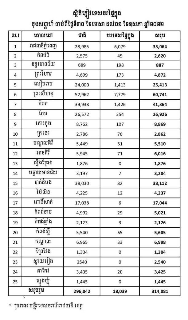 (ភ្នំពេញ)៖ លោក ថោង ខុន រដ្ឋមន្ត្រីក្រសួងទេសចរណ៍ បានឱ្យដឹងថា នាចុងសប្តាហ៍ ថ្ងៃទី៣០ ខែមេសា ដល់ថ្ងៃទី០១ ខែឧសភា ឆ្នាំ២០២២ នៅទូទាំងប្រទេសទទួលបានភ្ញៀវទេសចរសរុបមានចំនួន៣១៤,០៨១នាក់ ក្នុងនោះមានភ្ញៀវជាតិចំនួន២៩៦,០៤២នាក់ និងភ្ញៀវបរទេសផ្ទៃក្នុង១៨,០៣៩នាក់។