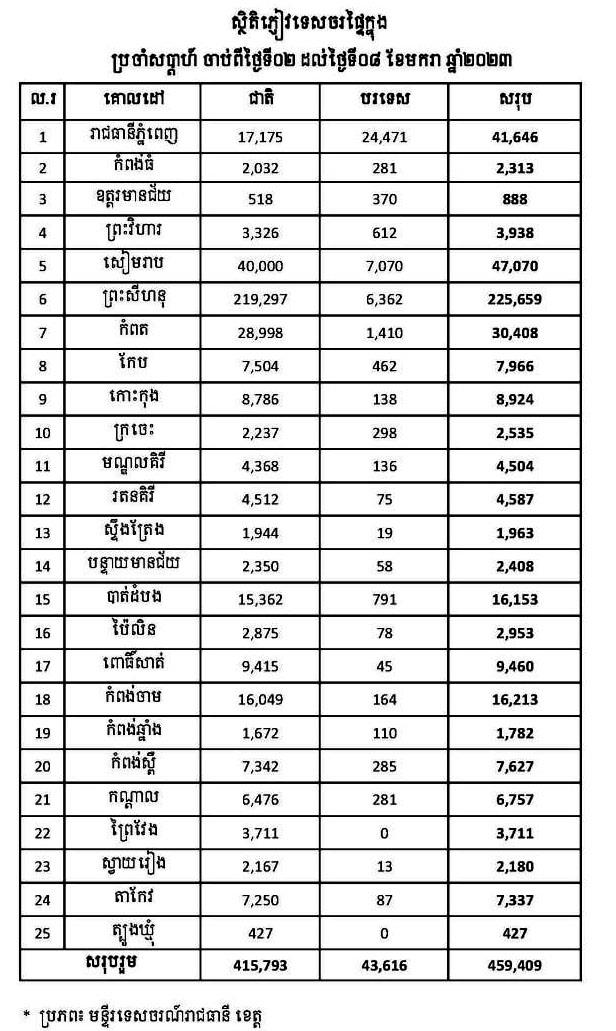 (ភ្នំពេញ)៖ ចាប់ពីថ្ងៃទី២-៨ ខែមករា ២០២៣ នៅទូទាំងប្រទេសកម្ពុជាទទួលបានភ្ញៀវសរុបមានចំនួន៤៥៩,៤០៩នាក់ ក្នុងនោះភ្ញៀវជាតិ៤១៥,៧៩៣នាក់ និងភ្ញៀវបរទេស៤៣,៦១៦នាក់។ នេះបើតាមលោក ថោង ខុន រដ្ឋមន្ត្រីក្រសួងទេសចរណ៍។
