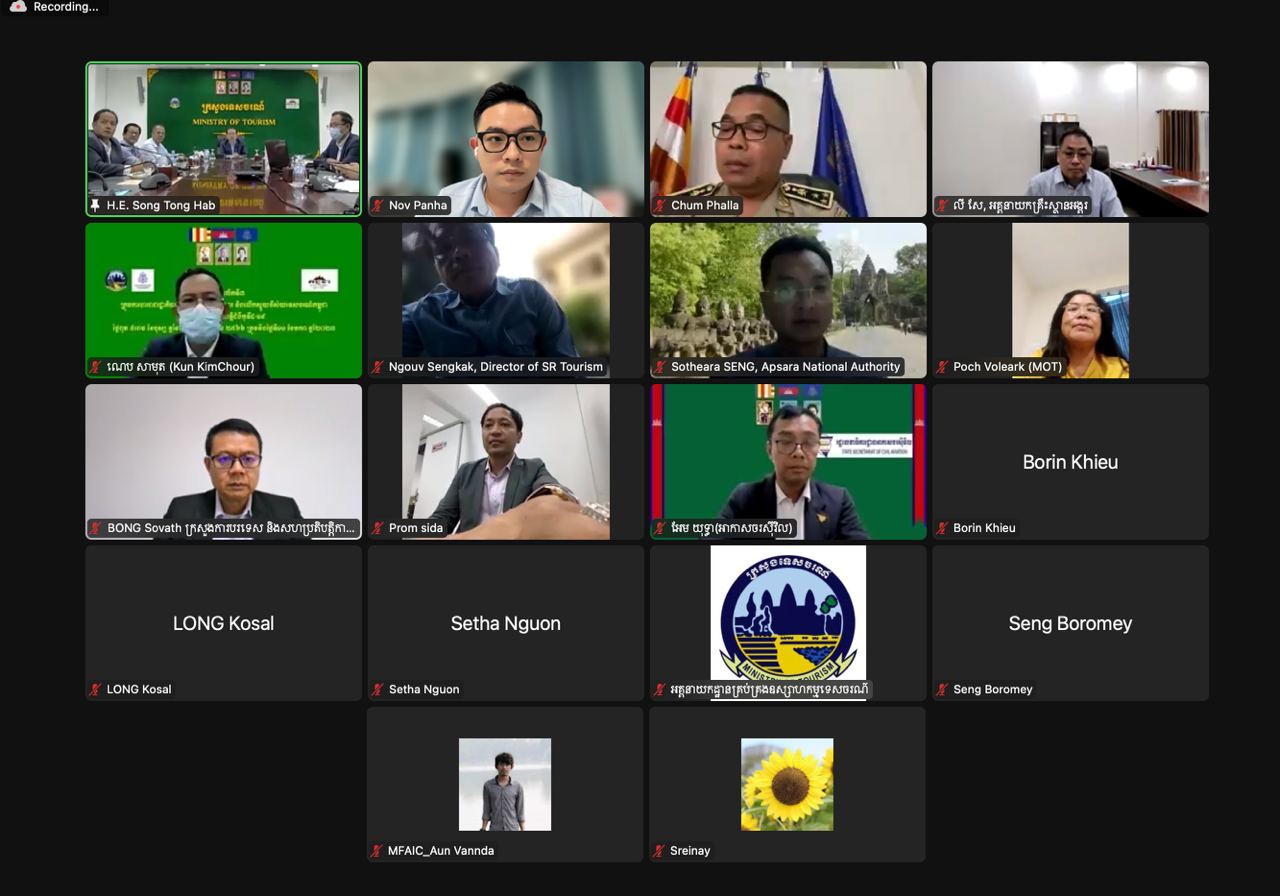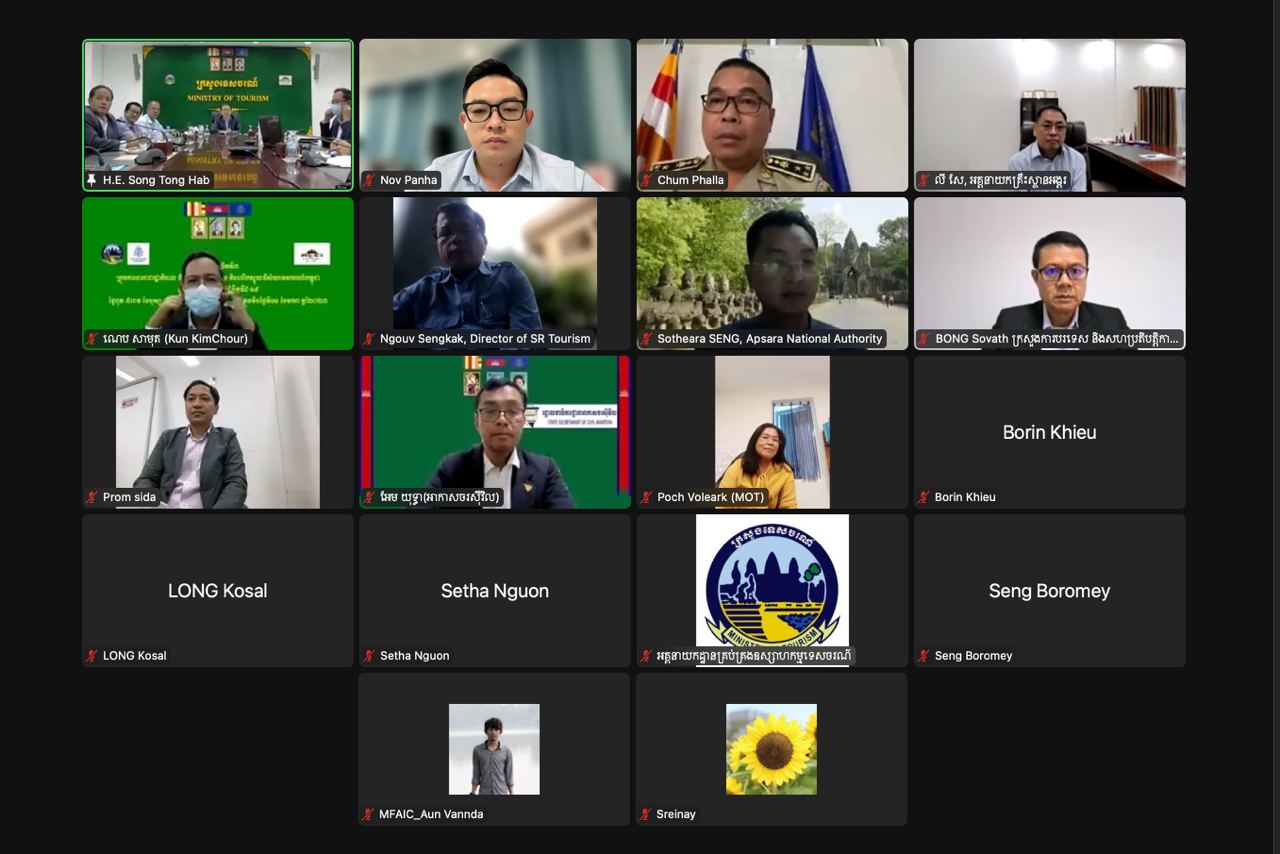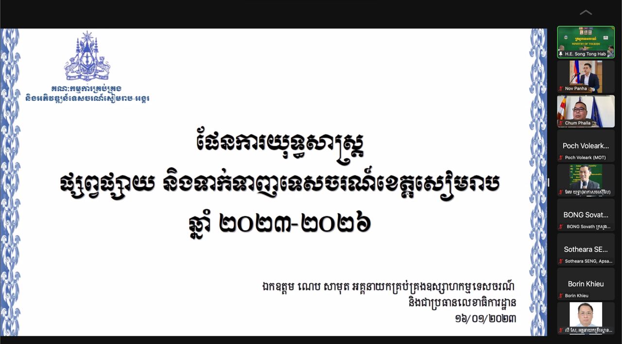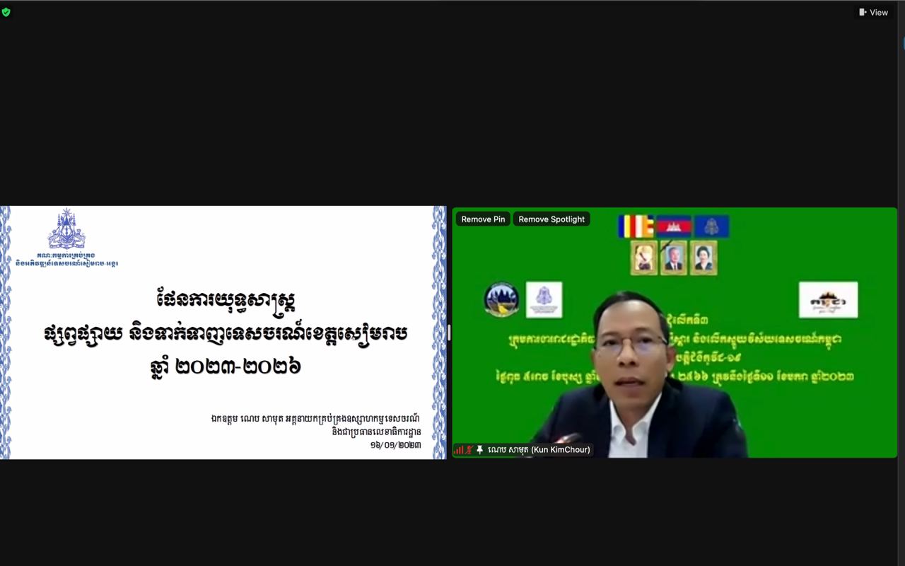 នារសៀលថ្ងៃទី១៦ ខែមករា ឆ្នាំ២០២៣ ឯកឧត្តម សុង តុងហាប់ រដ្ឋលេខាធិការក្រសួងទេសចរណ៍ និងជាប្រធានអនុគណៈកម្មការផ្សព្វផ្សាយ និងទាក់ទាញទេសចរណ៍ នៃគណៈកម្មការគ្រប់គ្រង និងអភិវឌ្ឍន៍ទេសចរណ៍សៀមរាប-អង្គរ (គ.អ.ទ.ស) បានដឹកនាំកិច្ចប្រជុំអនុគណ:កម្មការផ្សព្វផ្សាយ និងទាក់ទាញទេសចរណ៍ ដើម្បីពិនិត្យ និងពិភាក្សាលើសេចក្តីព្រាង “ផែនការយុទ្ធសាស្ត្រផ្សព្វផ្សាយ និងទាក់ទាញទេសចរណ៍ខេត្តសៀមរាប ឆ្នាំ២០២៣-២០២៦” ដែលប្រព្រឹត្តទៅដោយផ្ទាល់នៅទីស្តីការក្រសួងទេសចរណ៍ និងតាមរយៈប្រព័ន្ធវីដេអូហ៊្សូម (ZOOM) ដោយមានការចូលរួមពីសំណាក់ឯកឧត្តម លោកជំទាវ អនុប្រធាន សមាជិក-សមាជិការបស់អនុគណៈកម្មការ, ក្រសួង-ស្ថាប័នពាក់ព័ន្ធ, និង វិស័យឯកជន សរុបប្រមាណជិត ៧០ នាក់។
