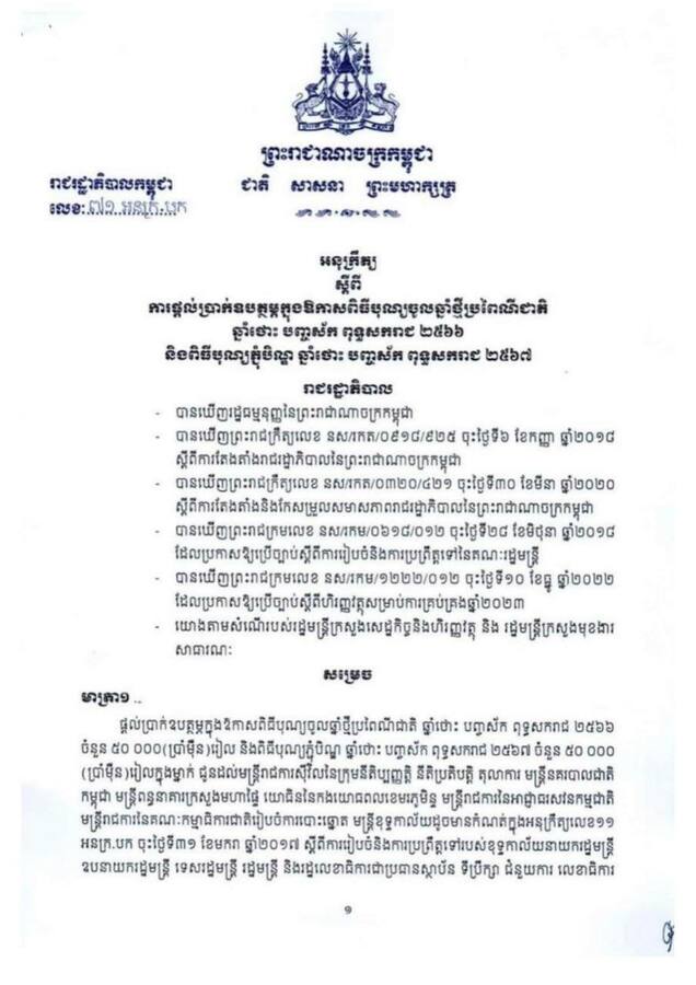 (ភ្នំពេញ)៖ សម្ដេចតេជោ ហ៊ុន សែន នាយករដ្ឋមន្ដ្រីនៃកម្ពុជា បានចេញអនុក្រឹត្យ ស្ដីពីការផ្ដល់ប្រាក់ឧបត្ថម្ភ ៥ម៉ឺនរៀលក្នុងឱកាសពិធីបុណ្យចូលឆ្នាំថ្មី ប្រពៃណីជាតិ ឆ្នាំថោះ បញ្ចស័ក ពុទ្ធសករាជ ២៥៦៦ និងពិធីបុណ្យភ្ជុំបិណ្ឌ ឆ្នាំថោះ បញ្ចស័ក ពុទ្ធសករាជ ២៥៦៧។ នេះបើតាមអនុក្រឹត្យនៅថ្ងៃទី៣១ ខែមីនា ឆ្នាំ២០២៣៕