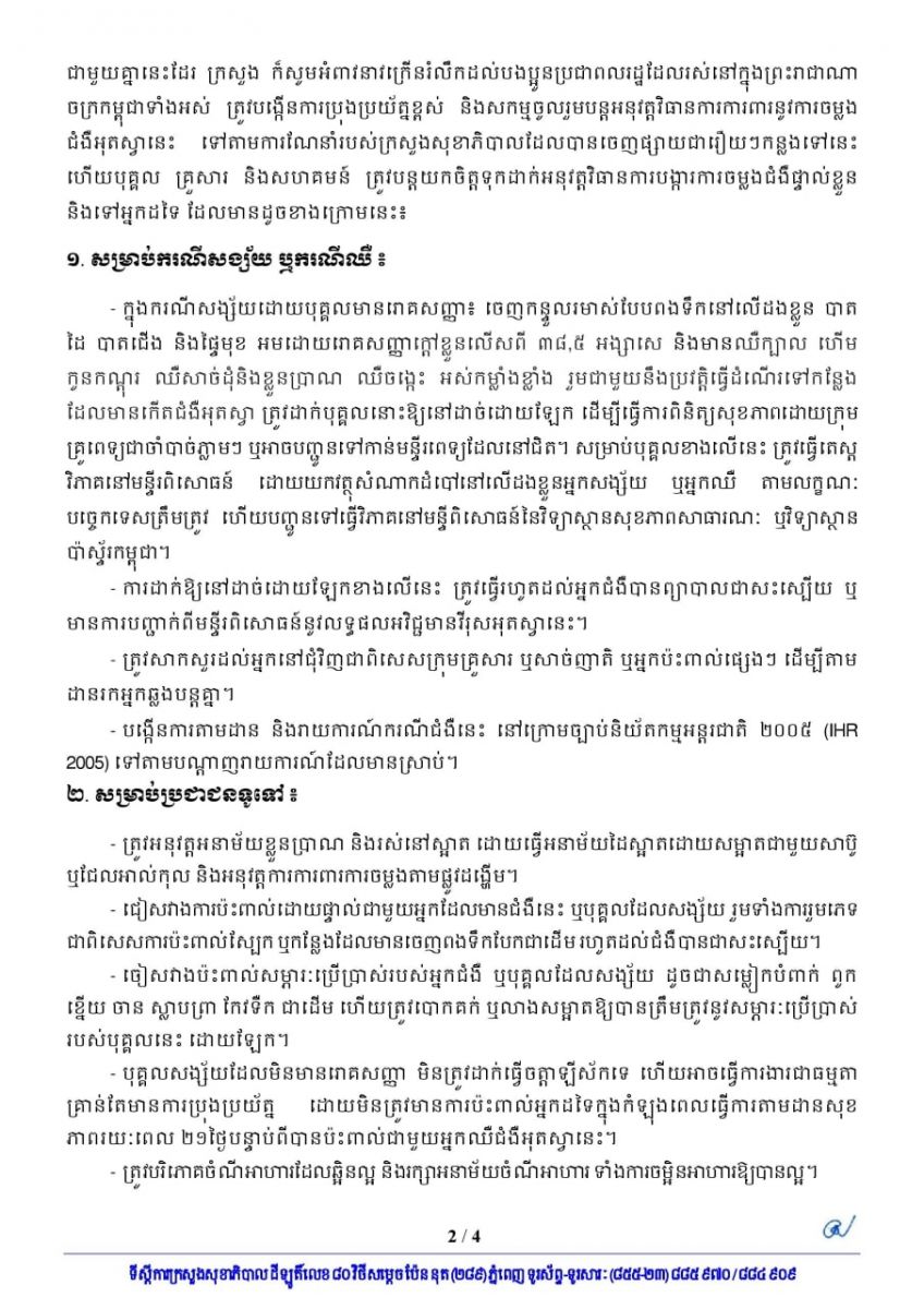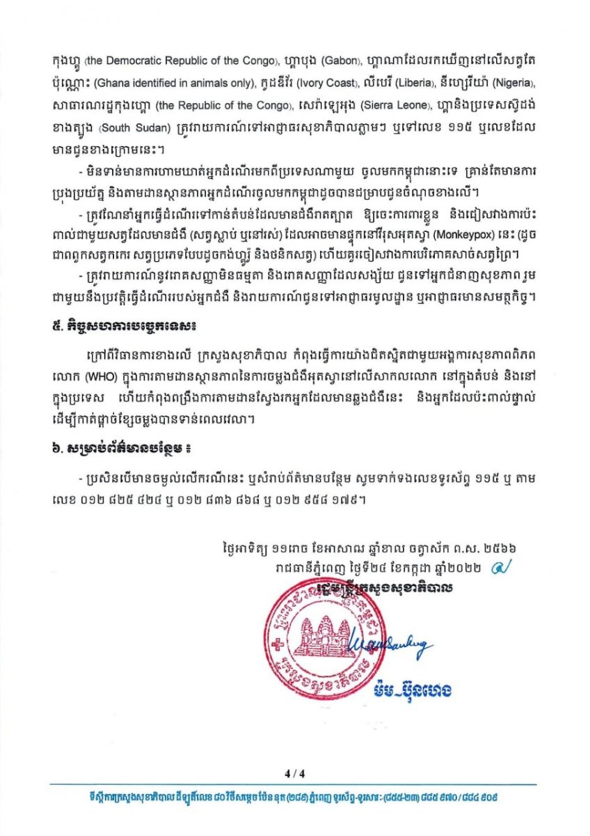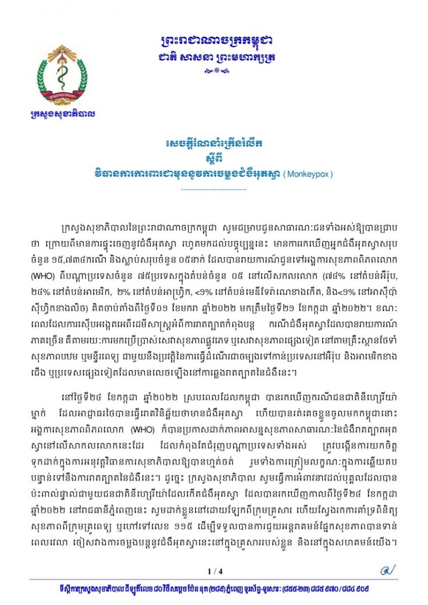 បុគ្គលដែលប៉ះពាល់ផ្ទាល់ជាមួយបុរសជនជាតិនីហ្សេរីយ៉ាផ្ទុកជំងឺអុតស្វា ក្រសួងសុខាភិបាលអំពាវនាវឱ្យនៅដាច់ដោយឡែកពីក្រុមគ្រួសារ និងទទួលការតាមដានសុខភាព