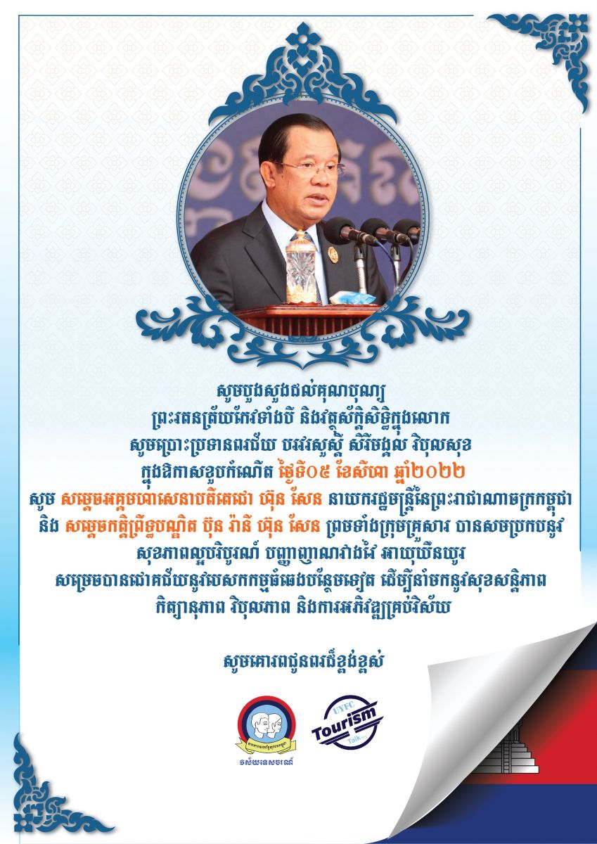 សូម សម្ដេចអគ្គមហាសេនាបតីតេជោ ហ៊ុន សែន នាយករដ្ឋមន្ត្រីនៃព្រះរាជាណាចក្រកម្ពុជា និង សម្តេចកត្តិព្រឹទ្ធបណ្ឌិត ប៊ុន រ៉ានី ហ៊ុន សែន ព្រមទាំងក្រុមគ្រួសារ បានសមប្រកបនូវ សុខភាពល្អបរិបូរណ៍ បញ្ញាញាណវាងវៃ អាយុយឺនយូរ សម្រេចបានជោគជ័យនូវបេសកកម្មធំធេងបន្ថែមទៀត ដើម្បីនាំមកនូវសុខសន្តិភាព កិត្យានុភាព វិបុលភាព និងការអភិវឌ្ឍគ្រប់វិស័យ