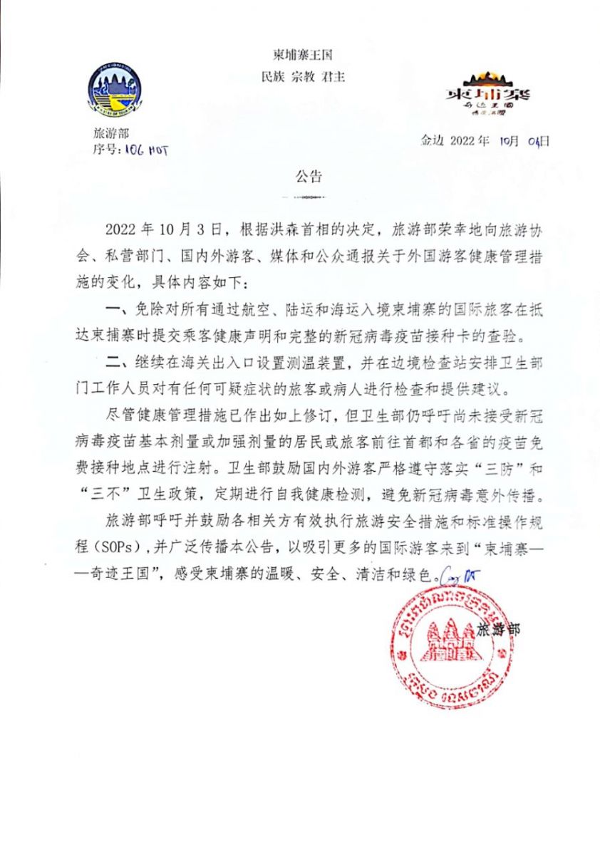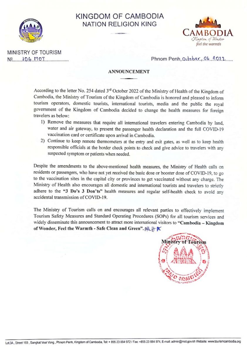 ក្រសួងទេសចរណ៍ចេញសេចក្តីជូនដំណឹង ស្តីពីការកែសម្រួលនូវវិធានការសុខាភិបាលចំពោះអ្នកដំណើរមកពីបរទេស