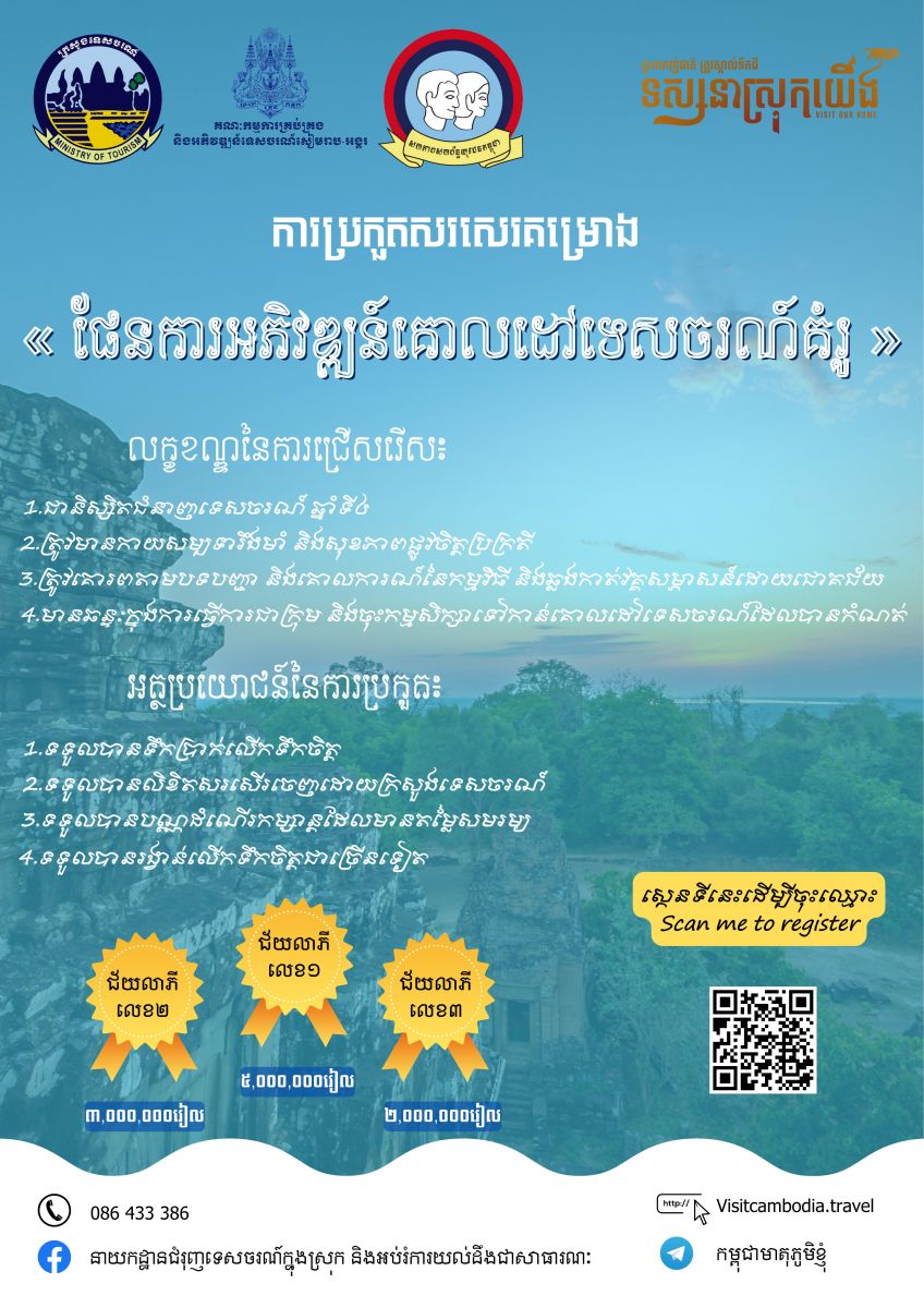 សូមបញ្ជាក់ថា កម្មវិធីប្រកួតប្រជែងការរៀបចំផែនការអភិវឌ្ឍន៍គោលដៅទេសចរណ៍គំរូ ត្រូវបានរៀបចំឡើងដោយក្រសួងទេសចរណ៍ ស្របតាមវិធានការគោលនយោបាយជំរុញទេសចរណ៍ផ្ទៃក្នុង២០២១-២០២៣ ក្នុងគោលបំណងជំរុញចលនា ទេសចរណ៍ផ្ទៃក្នុង ស្របតាមយុទ្ធនាការ «ទស្សនា ស្រុកយើង» ស្របតាមពាក្យស្លោក «ស្រលាញ់ជាតិ ត្រូវស្គាល់ទឹកដី» ពិសេសអនុឡោមតាម អនុសាសន៍ដ៏ខ្ពង់ខ្ពស់ របស់សម្តេចតេជោ ហ៊ុន សែន នាយករដ្ឋមន្ត្រីនៃកម្ពុជា «ទេសចរណ៍ផ្សារ ភ្ជាប់ទឹកដី»។ កម្មវិធីប្រកួតប្រជែងជ្រើសរើសជ័យលាភីគ្រោងនឹងធ្វើឡើងនៅក្នុងខែធ្នូ ឆ្នាំ២០២២ ខាងមុខនេះផងដែរ៕