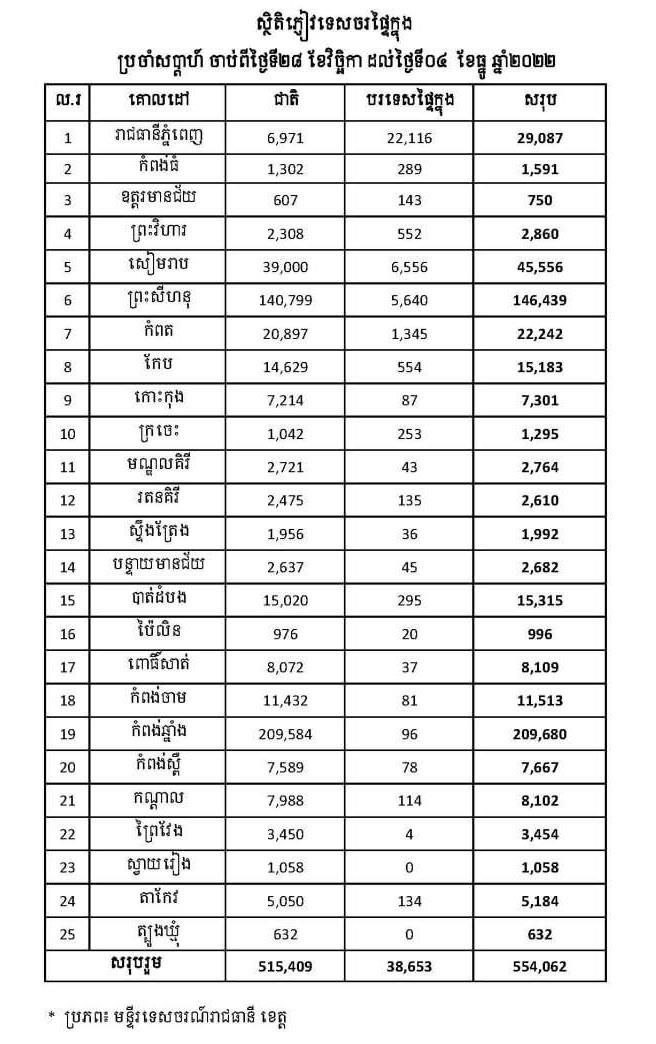 (ភ្នំពេញ)៖ ចាប់ពីថ្ងៃទី២៨ ខែវិច្ឆិកា ដល់ថ្ងៃទី៤ ខែធ្នូ ២០២២ នៅទូទាំងប្រទេសទទួលបានភ្ញៀវសរុប៥៥៤,០៦២នាក់ ក្នុងនោះភ្ញៀវជាតិ៥១៥,៤០៩នាក់ និងភ្ញៀវបរទេសផ្ទៃក្នុង៣៨,៦៥៣នាក់។ តួលេខនេះមានកំណើន ៤៩.៩៨% ធៀបនឹងសប្តាហ៍កន្លងមក។