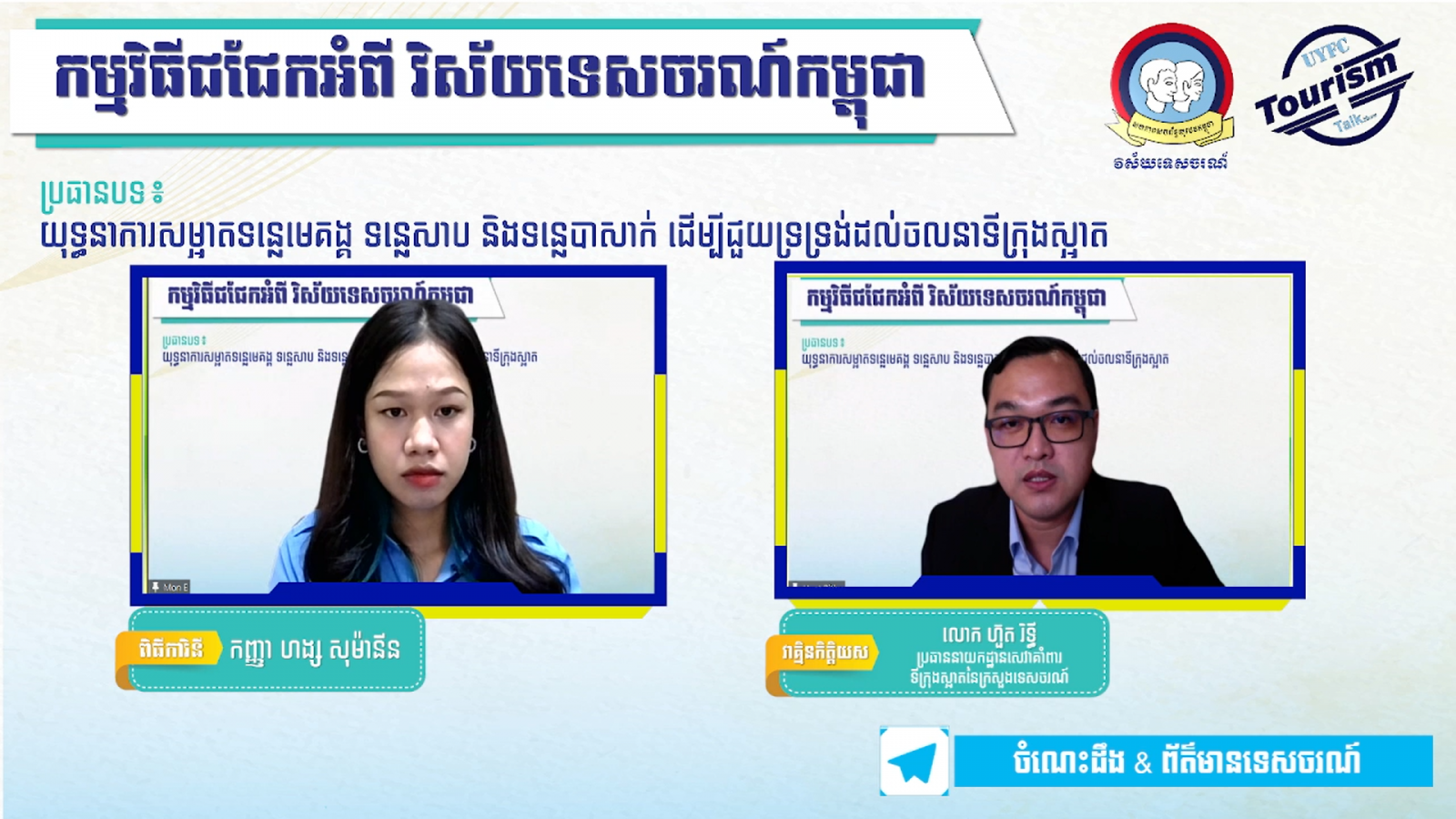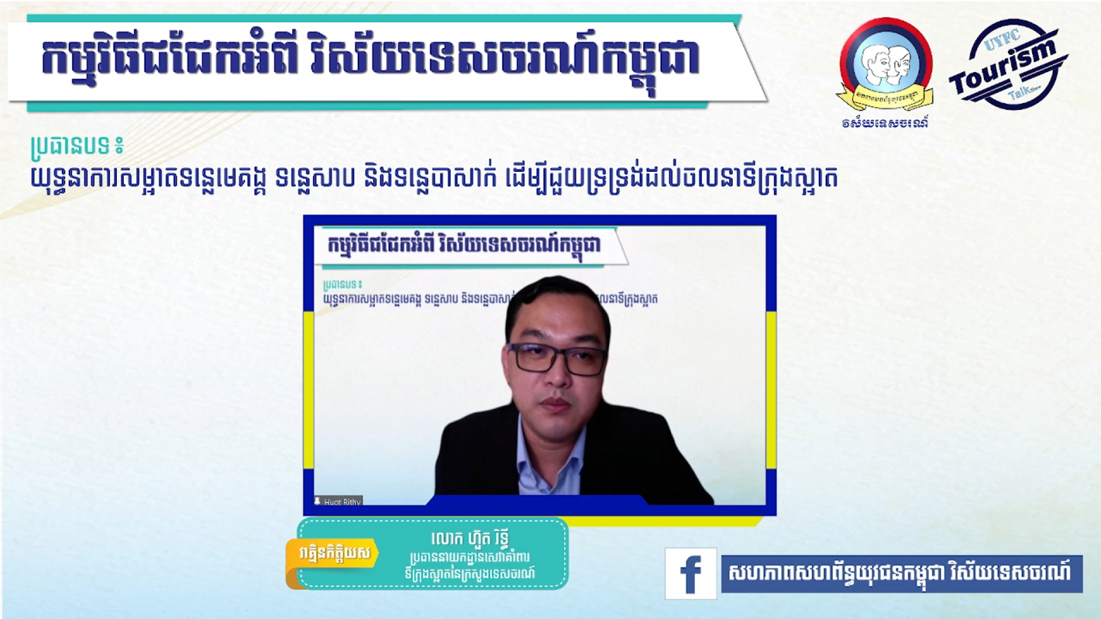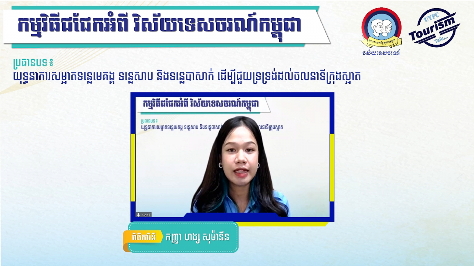 ដែលបានចូលរួមជាវាគ្មិនកិត្តិយសក្នុងកម្មវិធីជជែកអំពីវិស័យទេសចរណ៍ លើប្រធានបទ "យុទ្ធនាការសម្អាតទន្លេមេគង្គ ទន្លេសាប និងទន្លេបាសាក់ ដើម្បីជួយទ្រទ្រង់ដល់ចលនាប្រឡងប្រណាំងទីក្រុងស្អាត"។