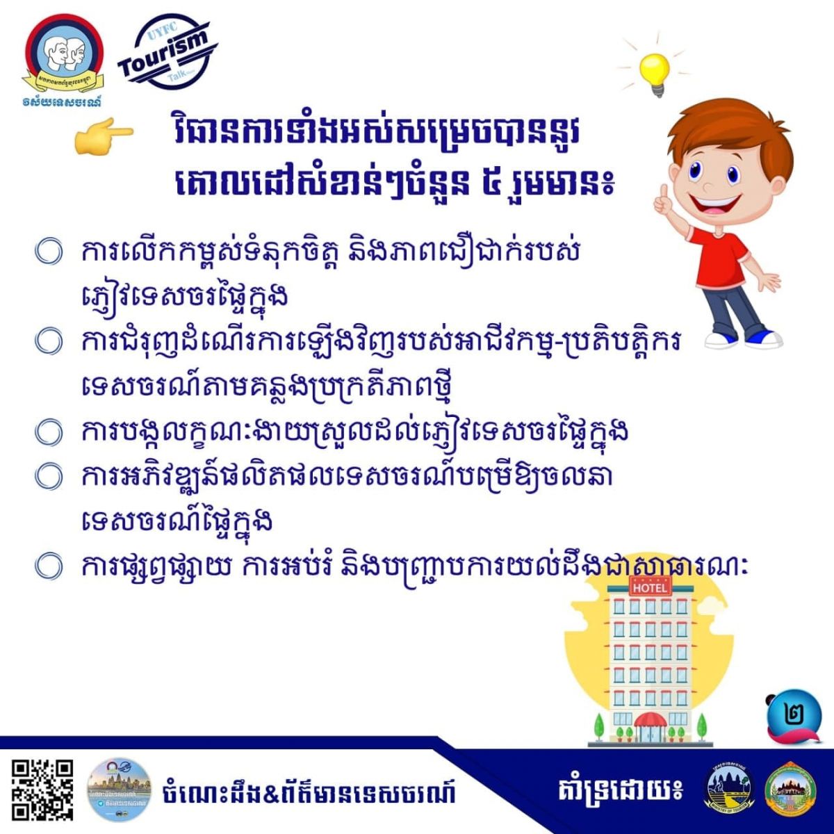តើដើម្បីធានាឱ្យបាននូវភាពជោគជ័យក្នុងការជំរុញចលនាទេសចរណ៍ផ្ទៃក្នុង រាជរដ្ឋាភិបាលបានគិតគូររៀបចំដាក់នូវវិធានការសំខាន់ចំនួនប៉ុន្មាន?អ្វីខ្លះ? ហើយវិធានការទាំងនោះមានគោលដៅអ្វីខ្លះ? - វេបសាយ ស.ស.យ.ក. វិស័យទេសចរណ៍