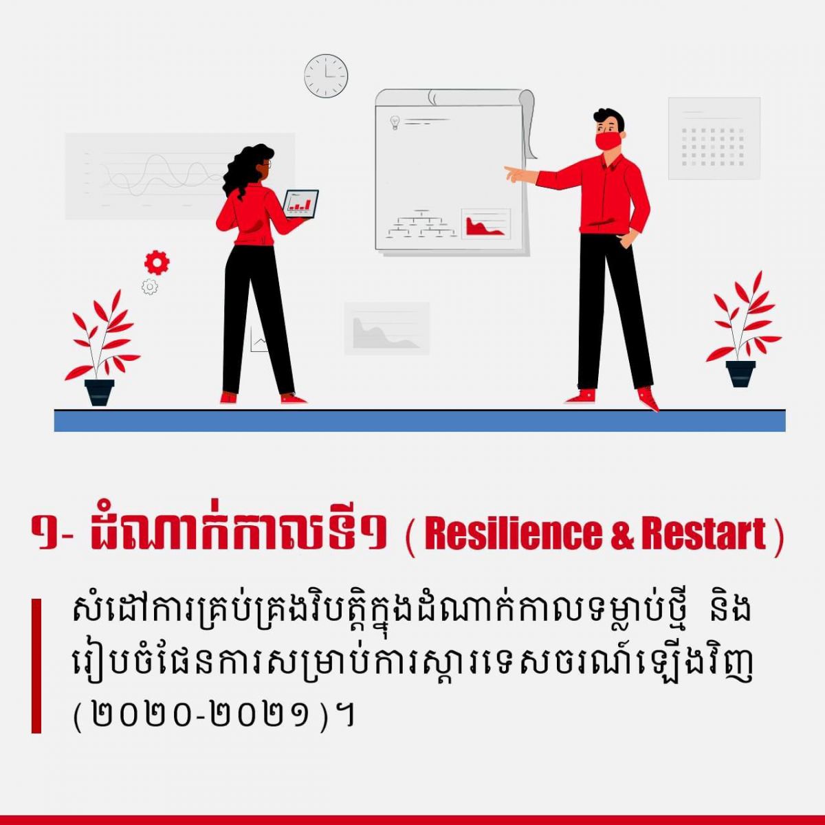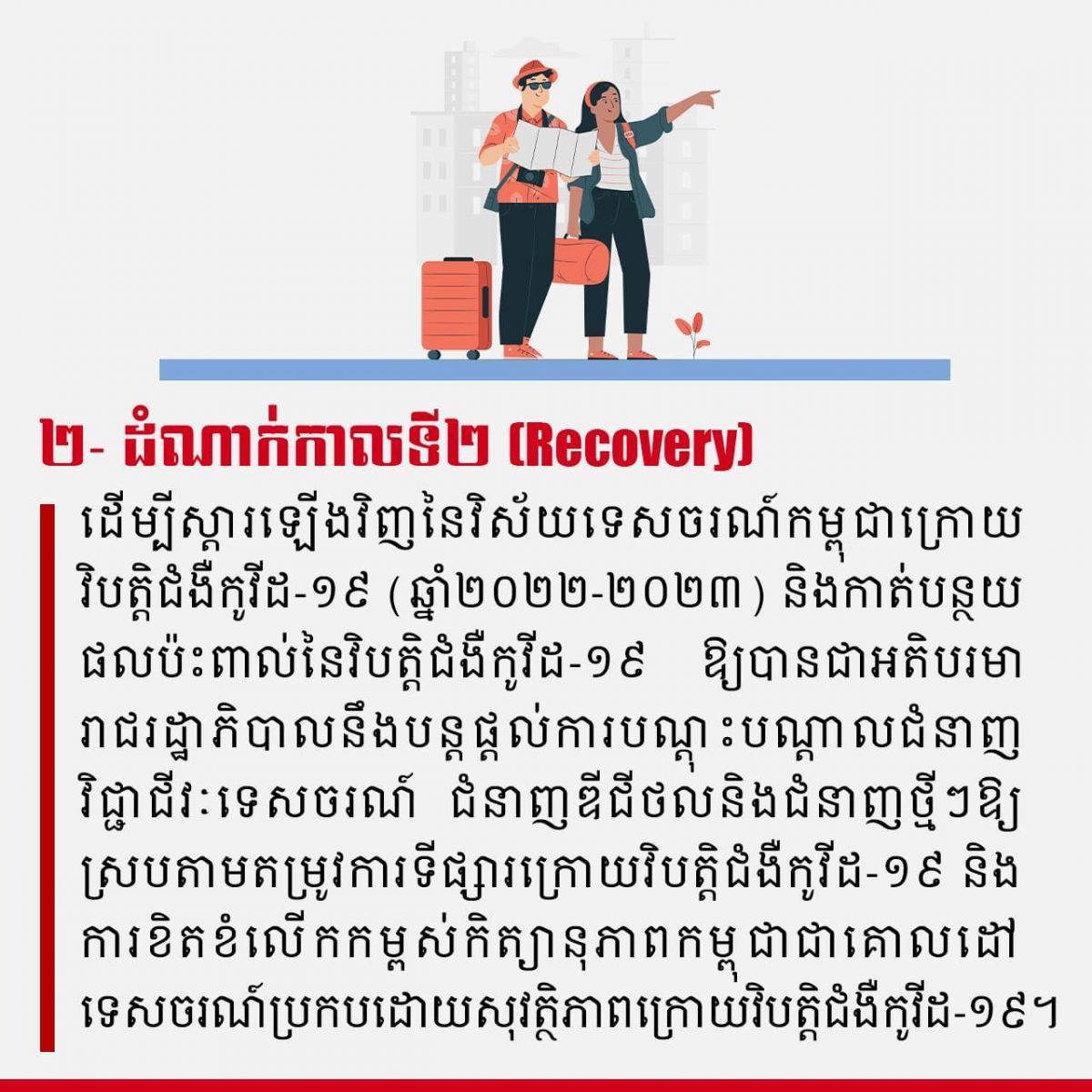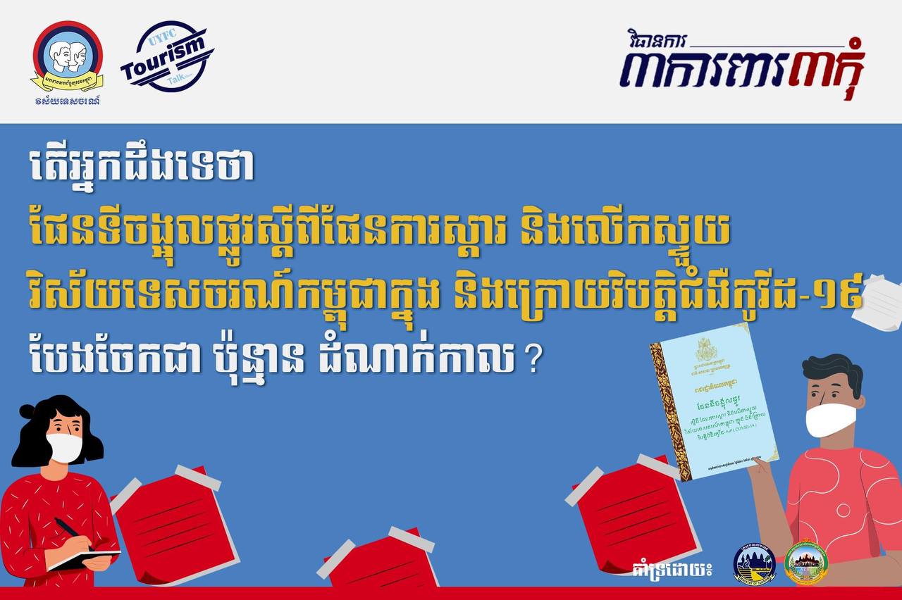 តើផែនទីចង្អុលផ្លូវស្ដីពី ផែនការស្ដារ និង លើកស្ទួយវិស័យទេសចរណ៍ក្នុង និងក្រោយវិបត្តិជំងឺកូវីដ-១៩ បែងចែងជាប៉ុន្មានដំណាក់កាល? - វេបសាយ ស.ស.យ.ក. វិស័យទេសចរណ៍
