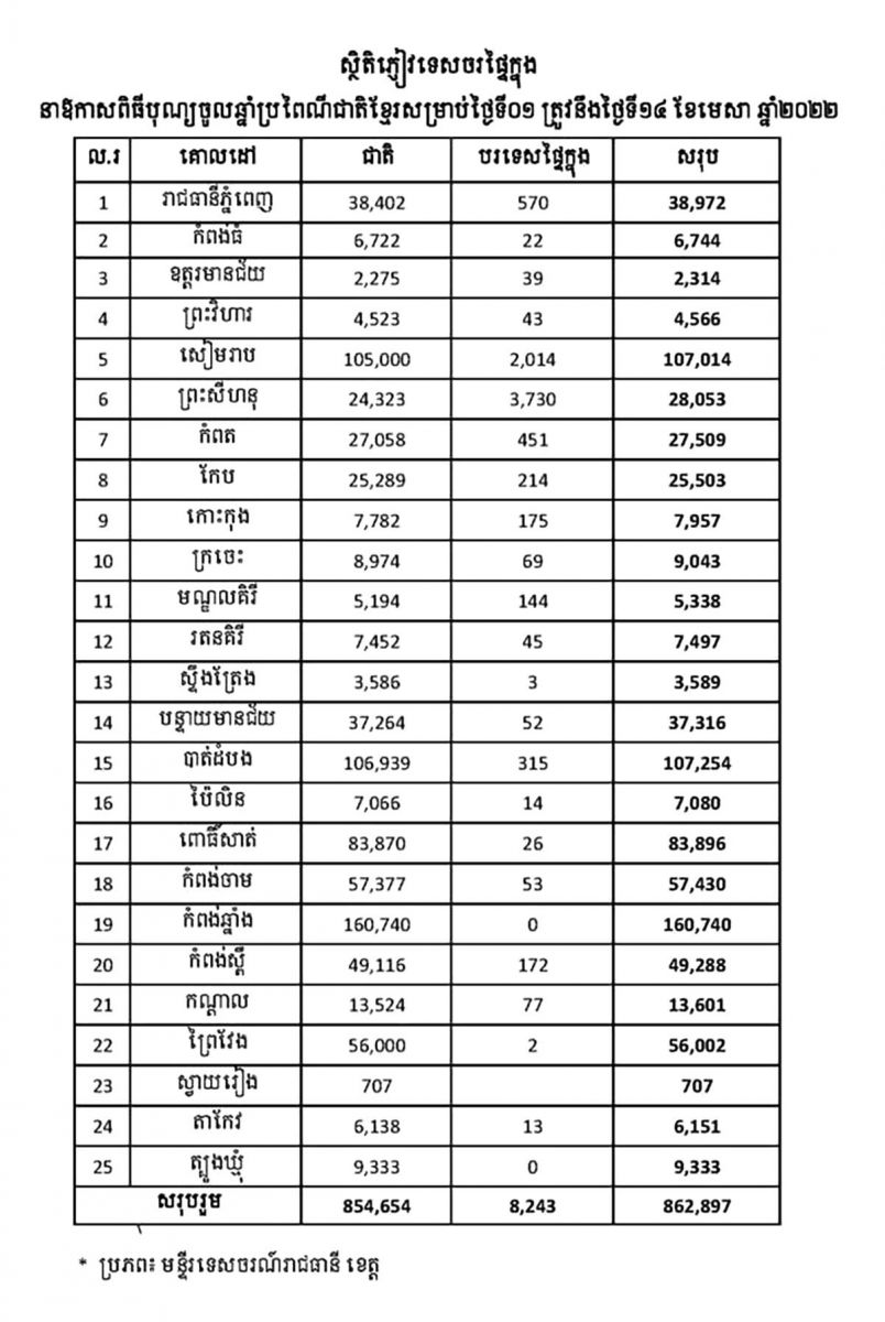 លោករដ្ឋមន្ត្រីបានថ្លែងថា ភ្ញៀវសរុបមានចំនួន៨៦២,៨៩៧នាក់ ក្នុងនោះភ្ញៀវជាតិ៨៥៤,៦៥៤នាក់ និងភ្ញៀវបរទេសផ្ទៃក្នុង៨,២៤៣នាក់។