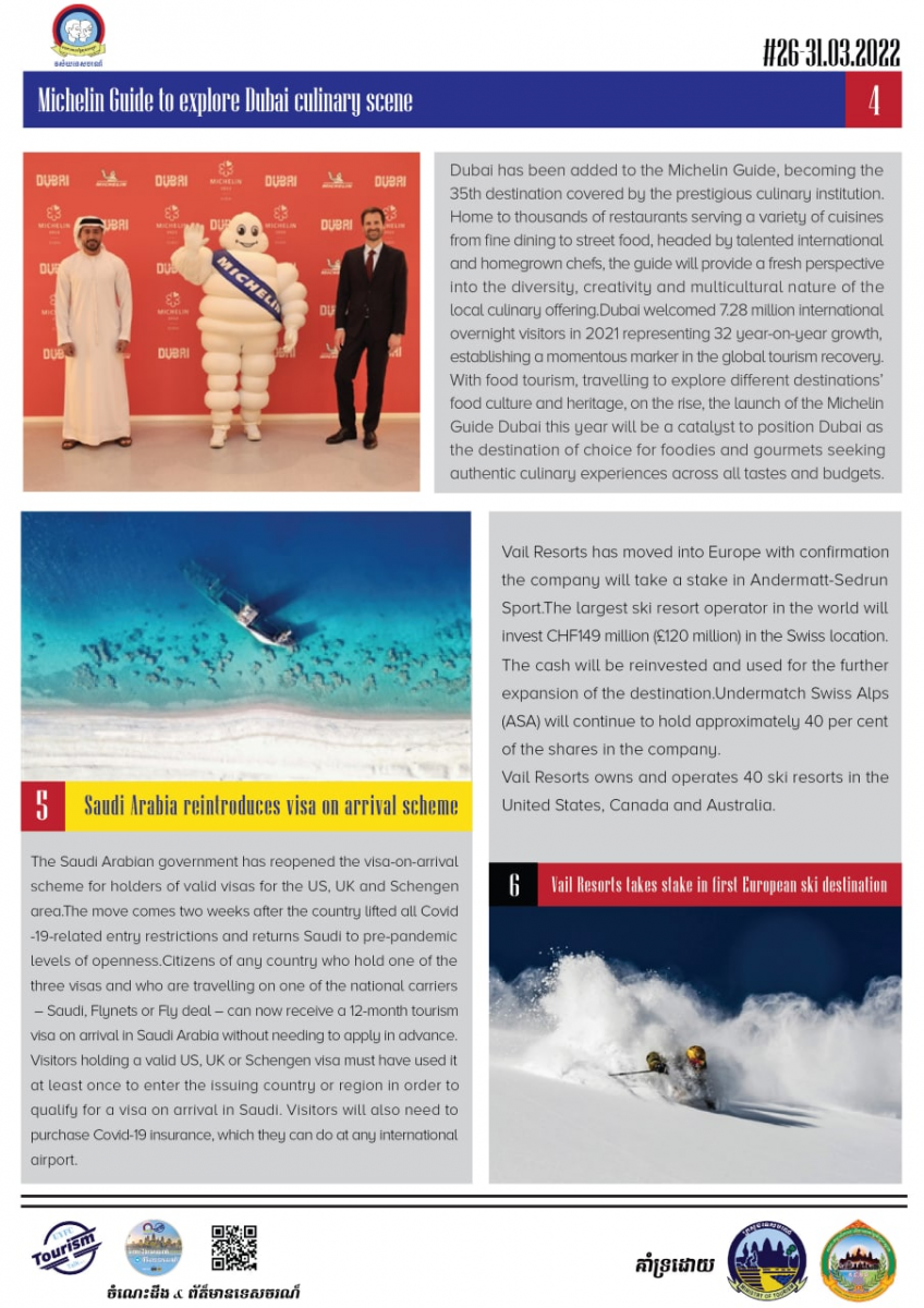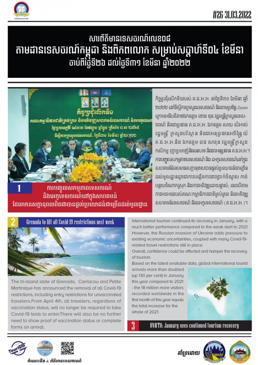 សារព័ត៌មានទេសចរណ៍លេខ០៨ សារព័ត៌មានទេសចរណ៍លេខ០៨តាមដានព័ត៌មានទេសចរណ៍កម្ពុជា និងពិភពលោក សម្រាប់សប្តាហ៍ទី០4ខែមីនា (ចាប់ពីថ្ងៃទី២៦_៣១ ខែមីនា ឆ្នាំ២០២២)