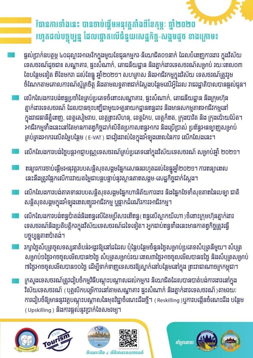តើរាជរដ្ឋាភិបាលបានដាក់ចេញនូវវិធានការអ្វីខ្លះក្នុងឆ្នាំ២០២១ ដើម្បីបន្តគ្រប់គ្រងផលប៉ះពាល់លើវិស័យទេសចរណ៍កម្ពុជា? - វេបសាយ ស.ស.យ.ក. វិស័យទេសចរណ៍