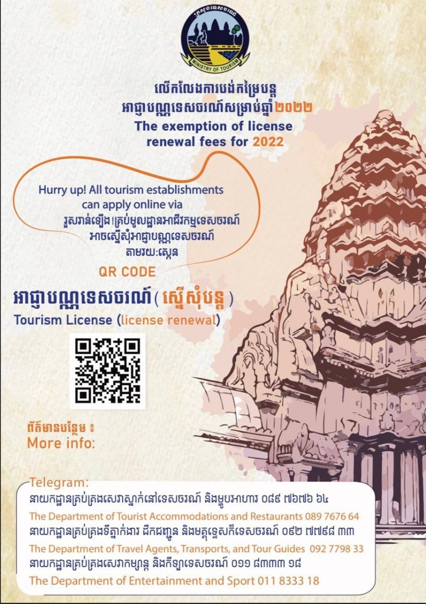 (រាជធានីភ្នំពេញ)៖ ក្រសួងទេសចរណ៍មានកិត្តយសជម្រាបជូនលោក លោកស្រីជាម្ចាស់អាជីវកម្មទេសចរណ៍ទាំងអស់ សូមរួសរាន់ដាក់ពាក្យស្នើសុំបន្តសុពលភាពអាជ្ញាបណ្ណទេសចរណ៍សម្រាប់ឆ្នាំ២០២២ ដោយផ្ទាល់មកក្រសួងទេសចរណ៍ ឬការស្កេន QR Code នៅលើបណ្ណផ្សព្វផ្សាយ (ដូចមានភ្ជាប់) ឬតាមរយៈមន្ទីរទេសចរណ៍រាជធានី ខេត្ត សម្រាប់អាជ្ញាបណ្ណទេសចរណ៍ដែលចេញដោយក្រសួងទេសចរណ៍។ ដោយឡែក សម្រាប់អាជ្ញាបណ្ណទេសចរណ៍ដែលចេញដោយរដ្ឋបាលថ្នាក់ក្រោមជាតិ ម្ចាស់អាជីវកម្មទេសចរណ៍ត្រូវដាក់ពាក្យស្នើសុំបន្តអាជ្ញាបណ្ណទេសចរណ៍សម្រាប់ឆ្នាំ២០២២ ពីរដ្ឋបាលថ្នាក់ក្រោមជាតិ។