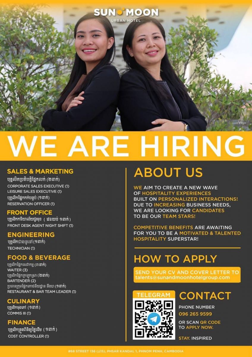 ឱកាសការងារក្នុងវិស័យទេសចរណ៍ សណ្ឋាគារ សាន់ & មូន ( SUN & MOON, Urban Hotel )