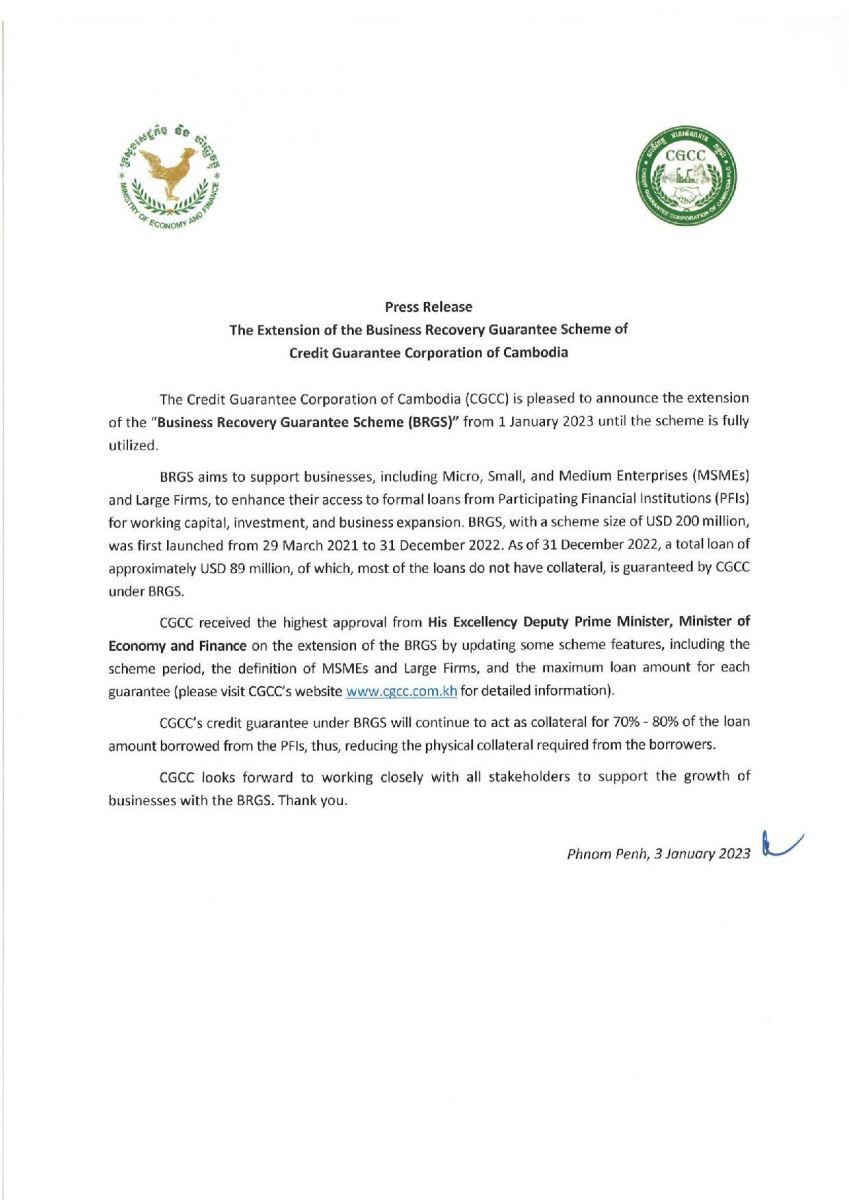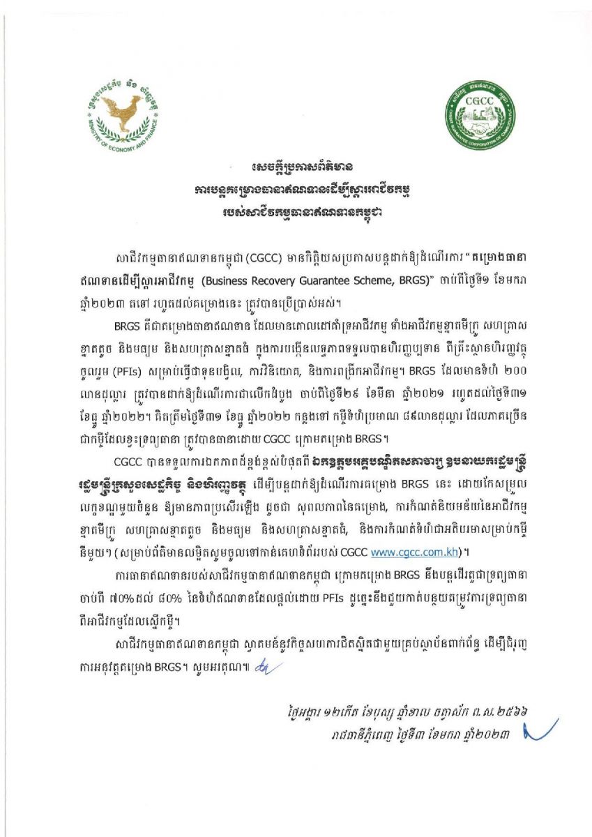 សេចក្តីប្រកាសព័ត៌មានរបស់ សាជីវកម្មធានាឥណទានកម្ពុជា (CGCC) ដែលនៅថ្ងៃទី៤ ខែមករា ឆ្នាំ២០២៣នេះបានប្រកាសបន្តដាក់ឱ្យដំណើរការ «គម្រោងធានាឥណទានដើម្បីស្តារអាជីវកម្ម» ចាប់ពីថ្ងៃទី១ ខែមករា ឆ្នាំ២០២៣ តទៅ រហូតដល់គម្រោងនេះ ត្រូវបានប្រើប្រាស់អស់។