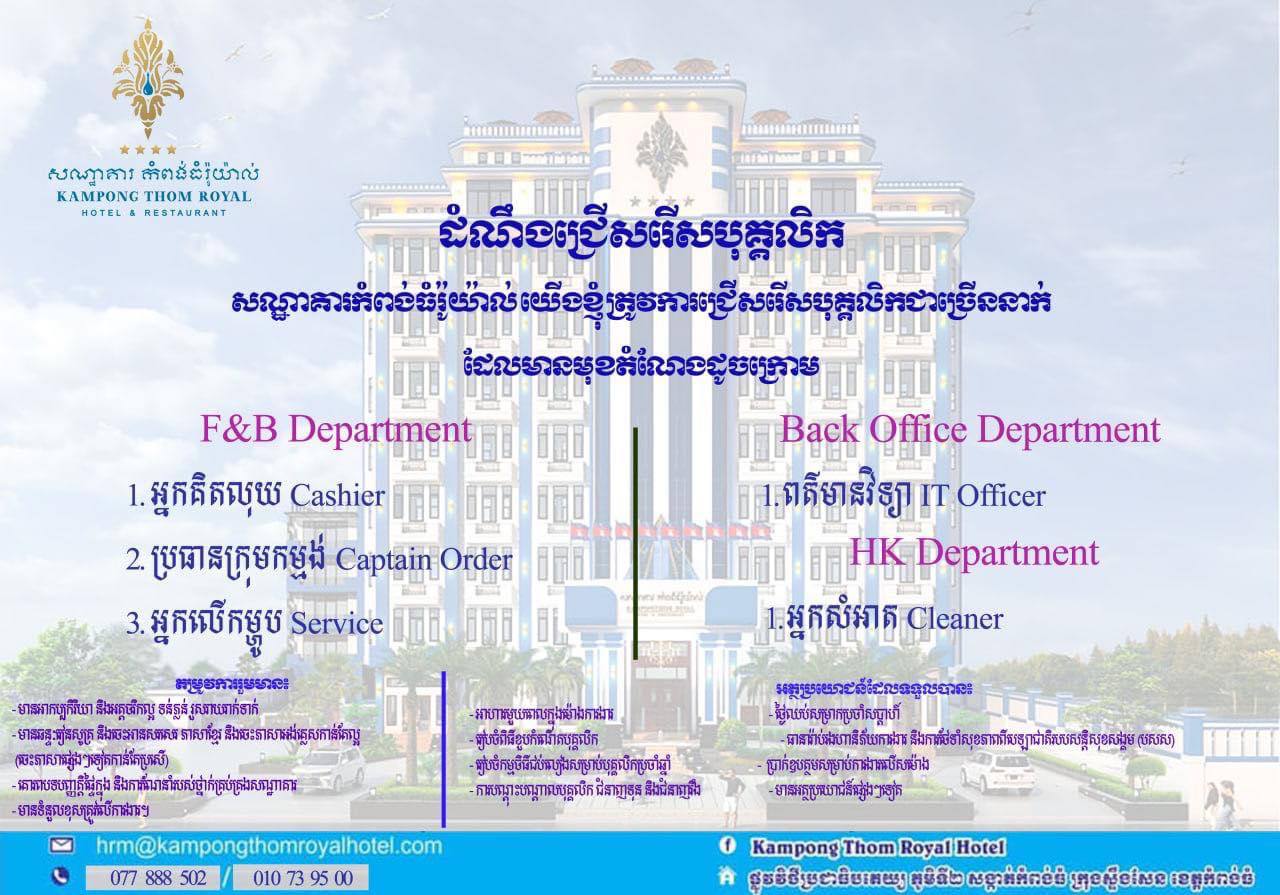 សណ្ឋាគារកំពង់ធំរ៉ូយ៉ាល់ Kampongthom Royal Hotel យើងខ្ញុំត្រូវការជ្រើសរើសបុគ្គលិក(ពេញម៉ោង)ដែលមានមុខដំណែងដូចខាងក្រោម៖