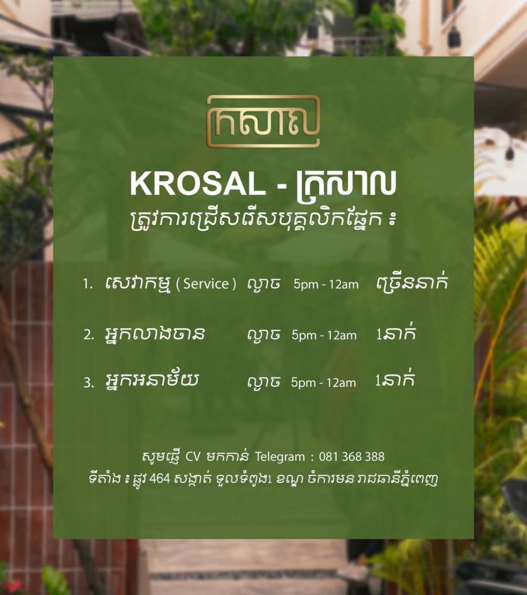 ភោជនីយដ្ឋាន ក្រសាល ( Krosal Coffee & Eatery ) យើងខ្ញុំត្រូវការបុគ្គលិកបន្ទាន់ ជាច្រើនអ្នក