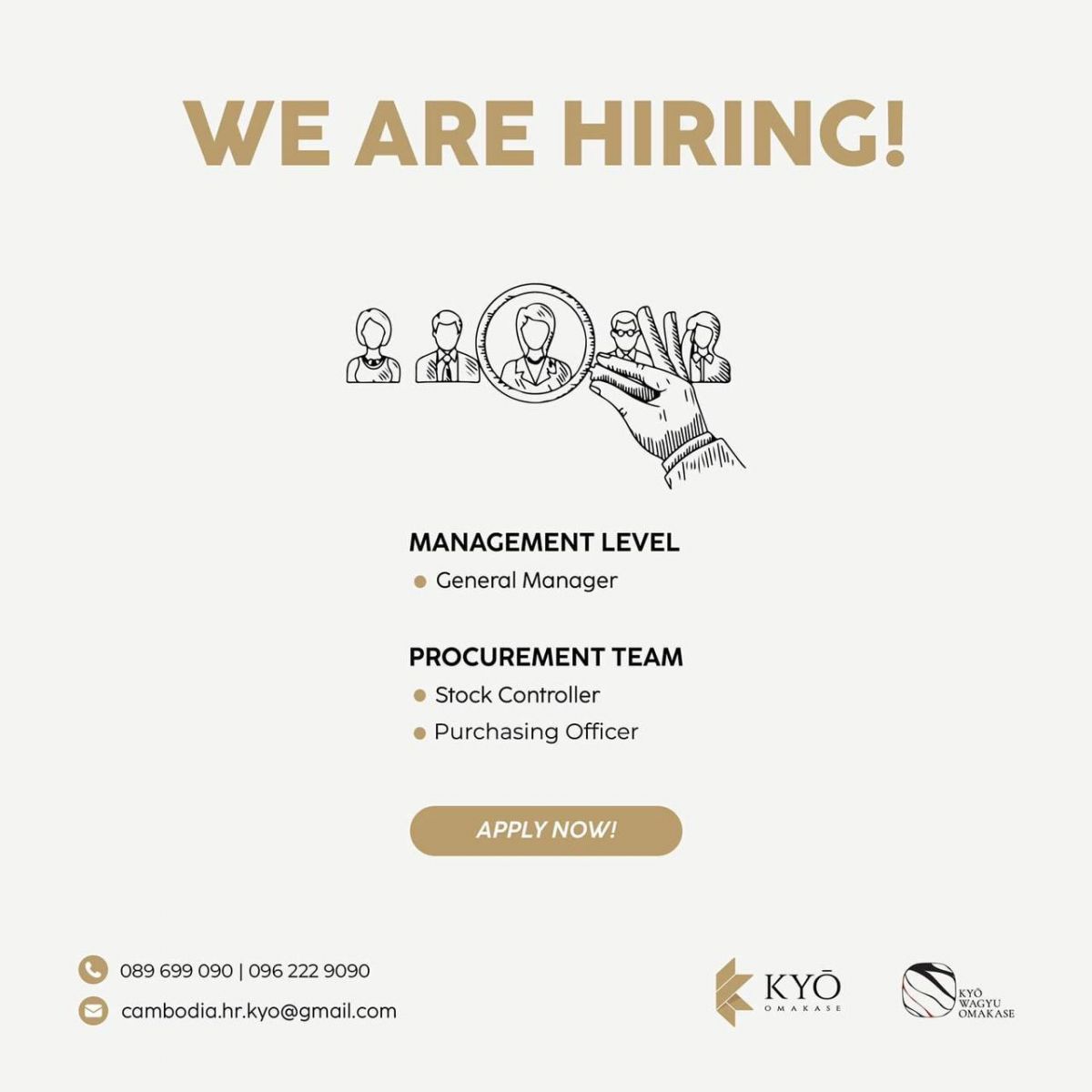ភោជនីយដ្ឋាន KYŌ ត្រូវការជ្រើសរើសបុគ្គលិកដែលមានជំនាញដូចផ្នែកខាងក្រោម: