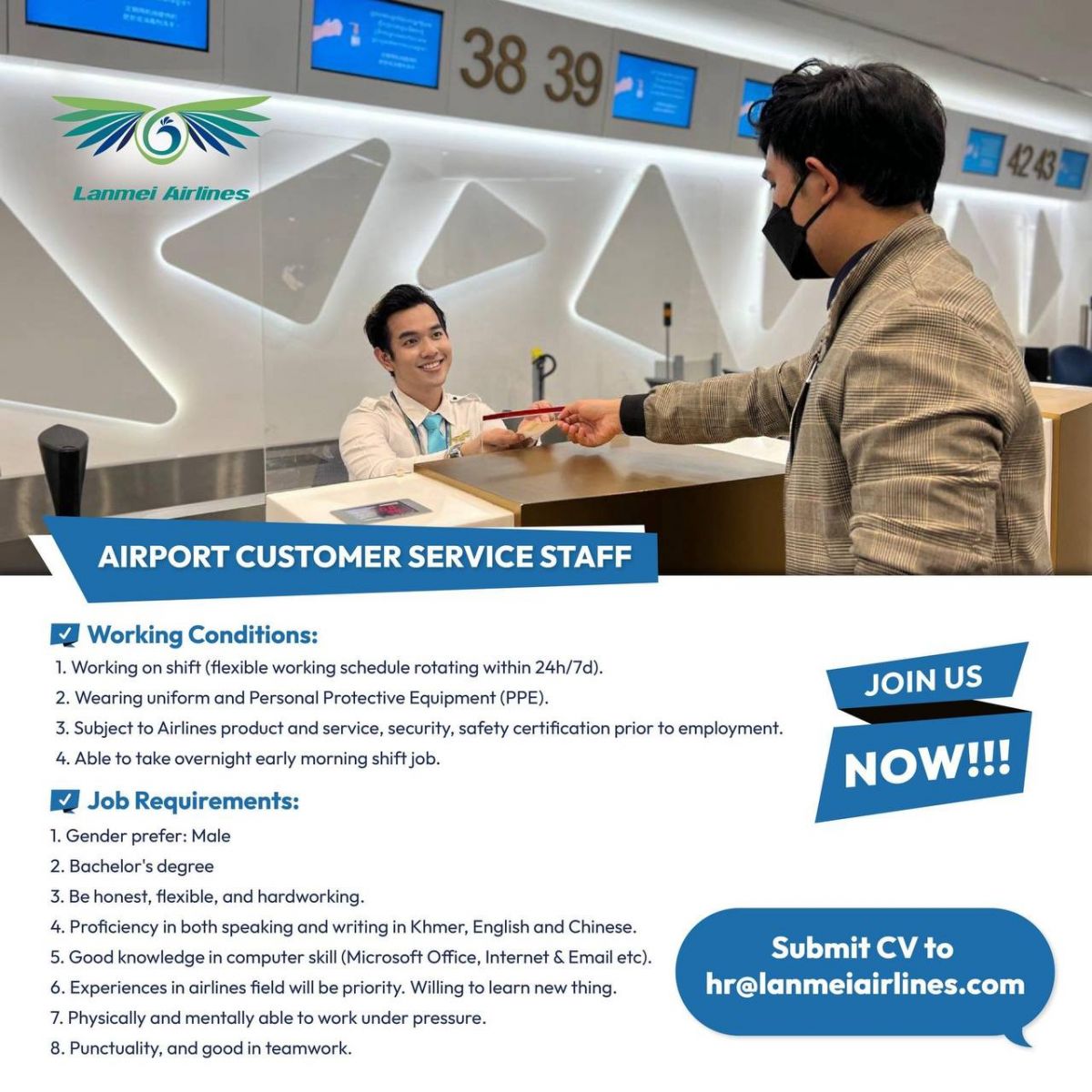 Lanmei Airlines យើងខ្ញុំត្រូវការជ្រើសរើសបុគ្គលិកផ្នែកAIRPORT CUSTOMER SERVICE STAFF