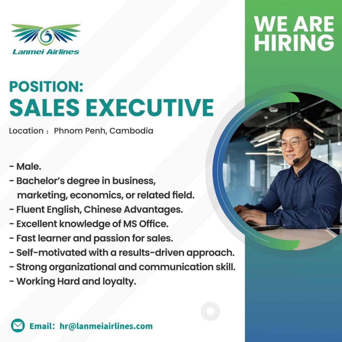 Lanmei Airlines ត្រូវការជ្រើសរើសបុគ្គលិកផ្នែក  Sales Executive បន្ទាន់ !!