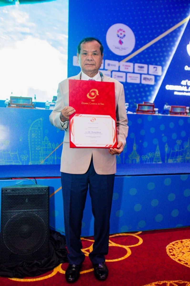 ឯកឧត្ដម វ៉ាត់ ចំរើន អគ្គលេខាធិការ NOCC បានឲ្យដឹងថា «ឯកឧត្តមបណ្ឌិត ថោង ខុន បានទទួលនូវគ្រឿងឥស្សរិយយសថ្នាក់ខ្ពស់បំផុត «ខ្សែកមាស» ដែលផ្ដល់ដោយក្រុមប្រឹក្សាអូឡាំពិកអាស៊ី គឺបានផ្ដល់នូវកិត្តិយសជូនដល់ការលះបង់ផ្ទាល់របស់ឯកឧត្តម ចំពោះចលនាអូឡាំពិក ក៏ដូចជាកីឡា ដែលឯកឧត្តមជាអ្នកកសាងនូវចលនាអូឡាំពិកកម្ពុជាបានរីកចម្រើន ដូចជាទិដ្ឋភាពកន្លងមកនេះ រហូតដល់ទទួលបានសិទ្ធិរៀបចំព្រឹត្តិការណ៍អន្ដរជាតិធំៗ គឺការប្រកួតកីឡាស៊ីហ្គេម-អាស៊ានប៉ារ៉ាហ្គេម ឆ្នាំ២០២៣ និងការប្រកួតកីឡាអូឡាំពិកយុវជនអាស៊ី ឆ្នាំ២០២៩»។